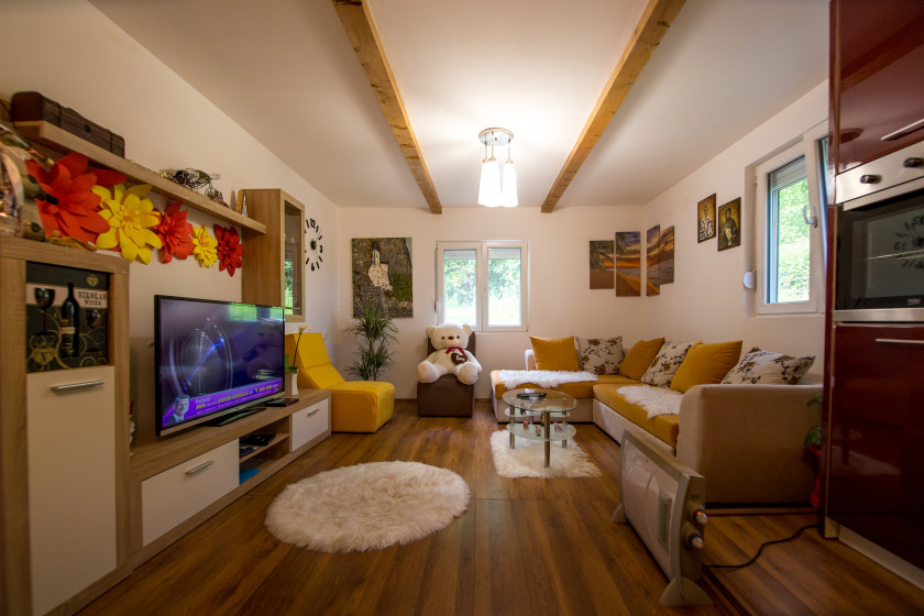 Dnevna soba sa velikim smart TV-om, radijatorom i klima uređajem