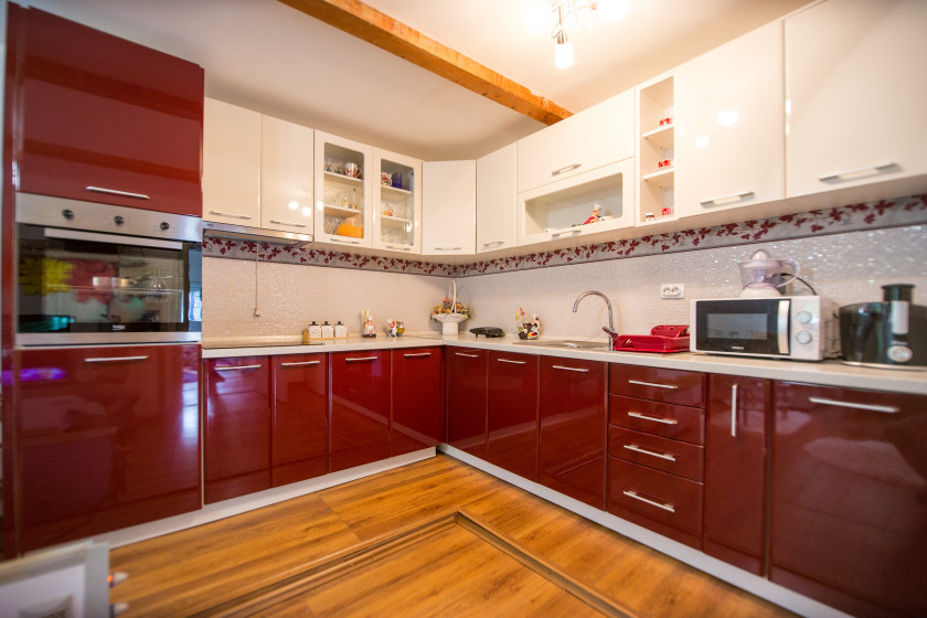 Kuhinja opremljena ugradnom rernom, šporetom, frižiderom, mikrotalasnom i aparatom za kafu