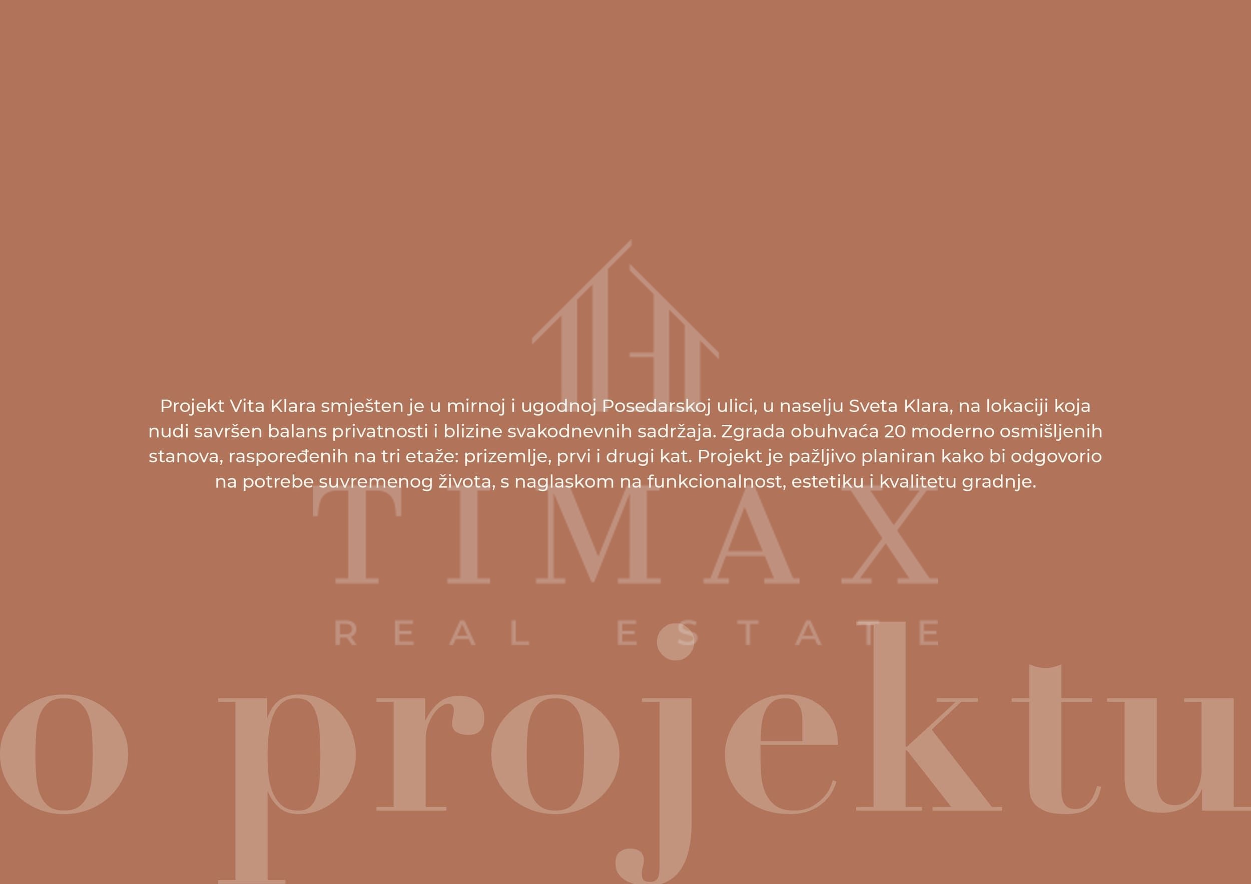 Projekt Vita Klara smješten je u mirnoj i ugodnoj Posedarskoj ulici, u naselju Sveta Klara, na lokaciji koja nudi savršen balans privatnosti i blizine svakodnevnih sadržaja.