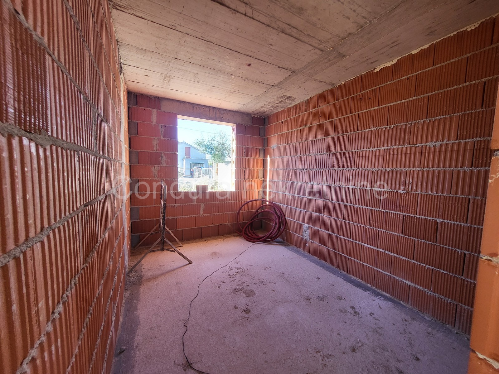 Kuća se se sastoji od: trijema, ulaznog hodnika, prostranog dnevnog boravka s blagovaonicom (26 m2), kuhinje, WC-a, hodnika, predsoblja, kupaonice, dvije spavaće sobe i velike natkrivene terase (15 m2).