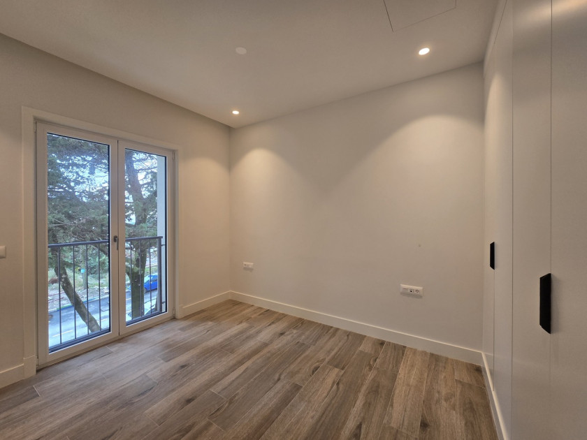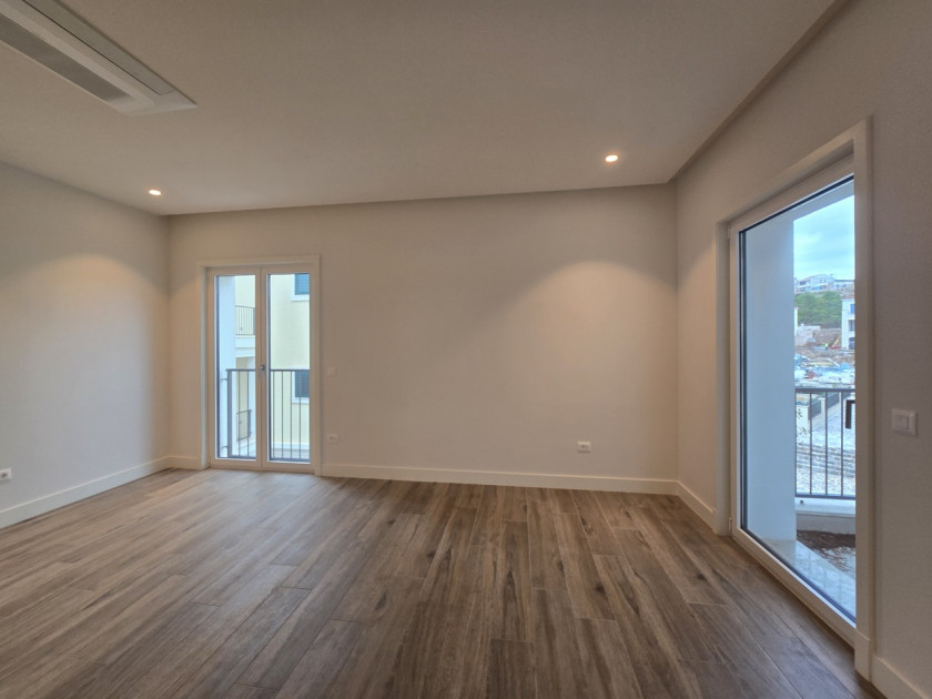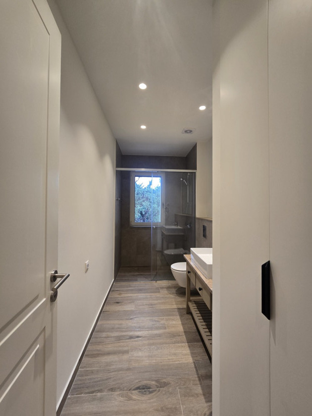 Stan je vrlo svijetao, s velikim panoramskim prozorima. Dnevni boravak ima dva izlaza na terasu, a u spavaćoj sobi francuski balkon. Prozor spavaće sobe nudi djelomičan pogled na more.