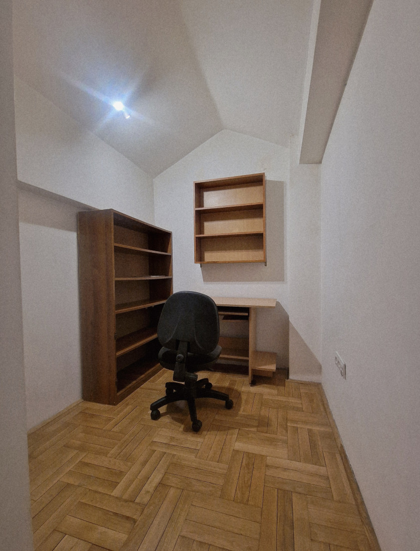Raspored: ulazni hodnik, kupatilo, dnevna soba sa trpezarijom, odvojena kuhinja sa prozorom. Na drugom nivou: toalet, spavaća soba i dodatna manja prostorija pogodna za radni prostor (takođe sa prozorom).