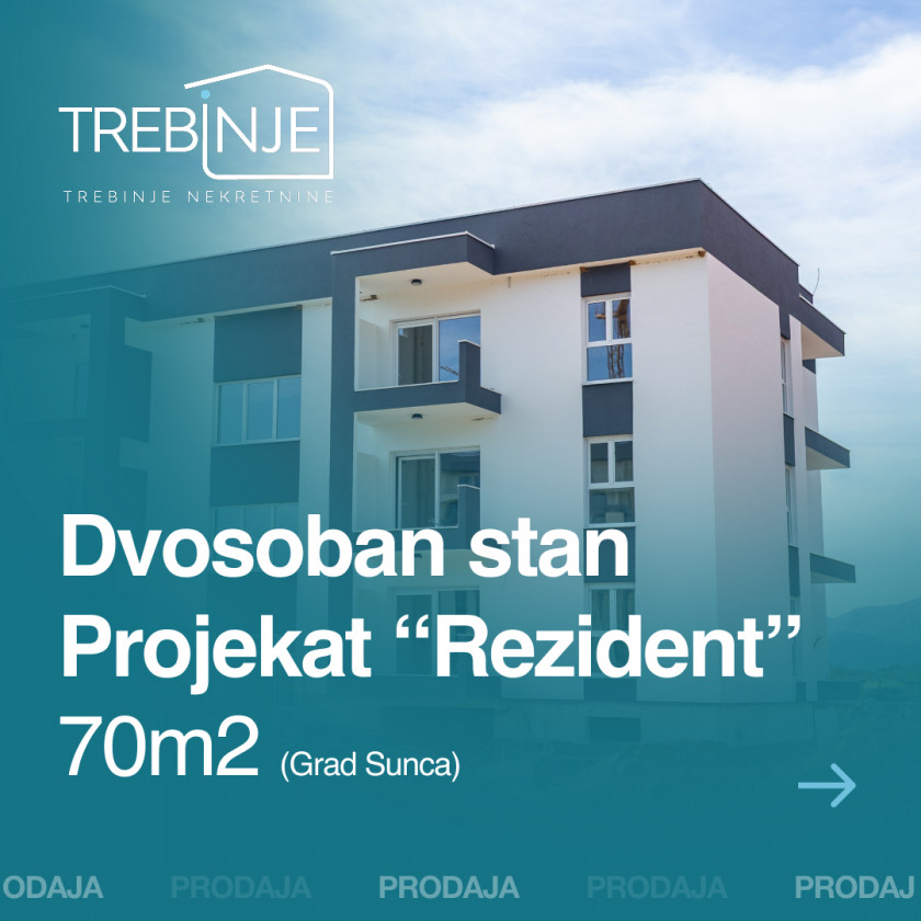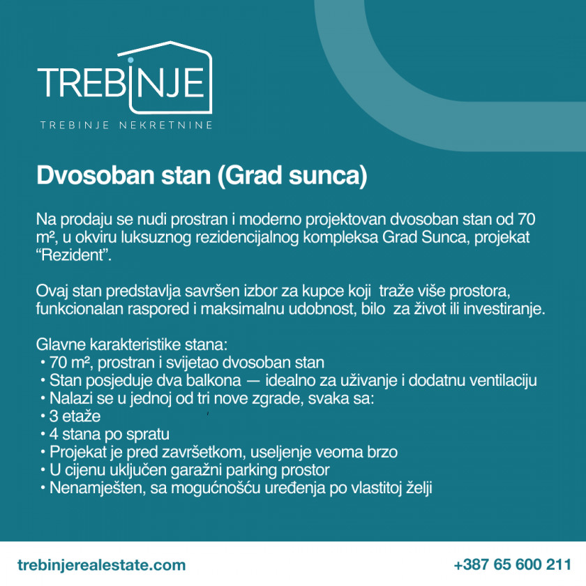 Na prodaju se nudi prostran i moderno projektovan dvosoban stan od 70 m², u okviru luksuznog rezidencijalnog kompleksa Grad Sunca, projekat “Rezident”.