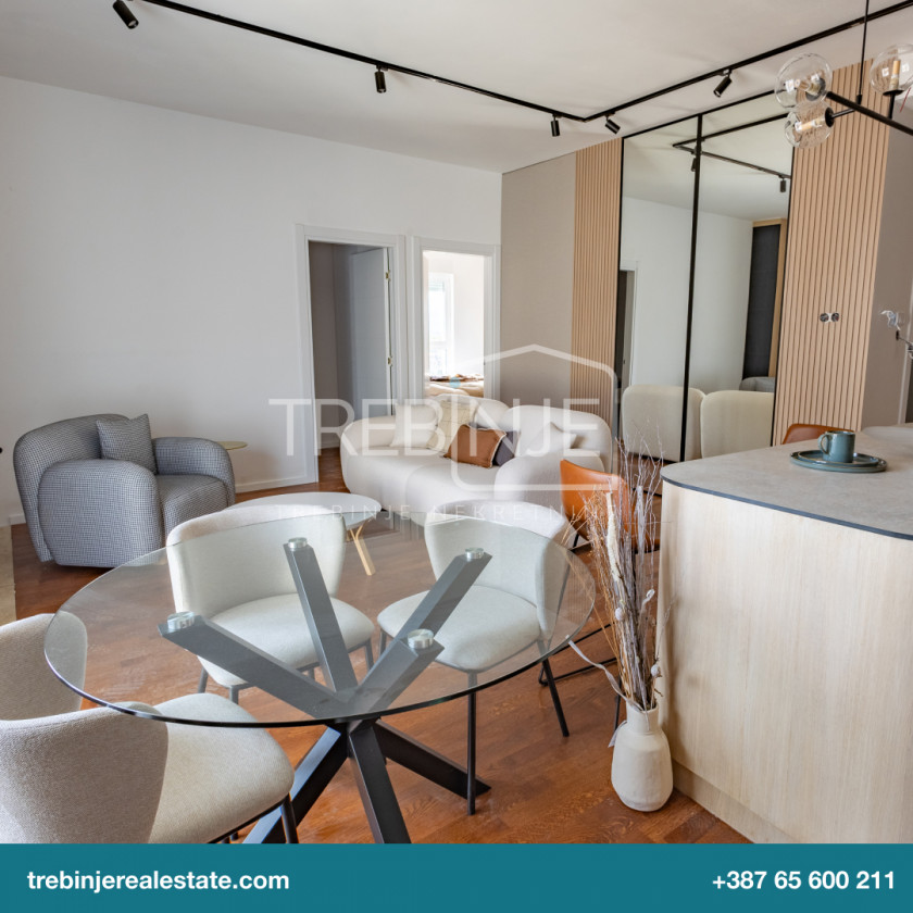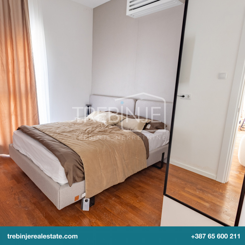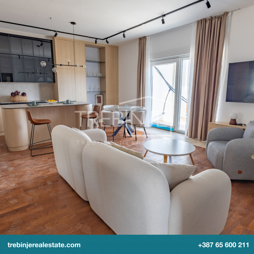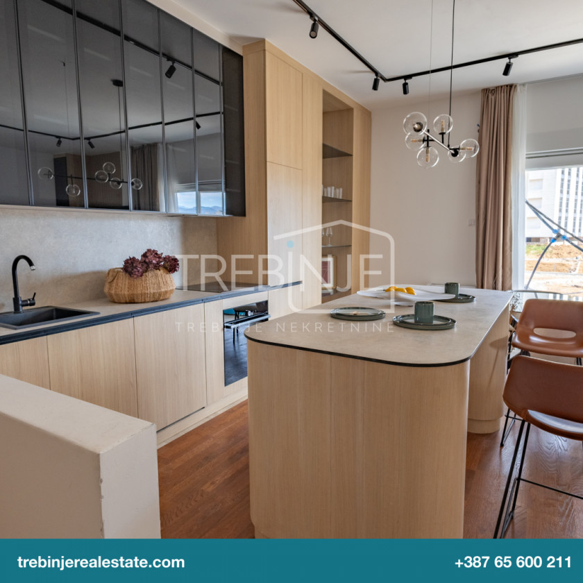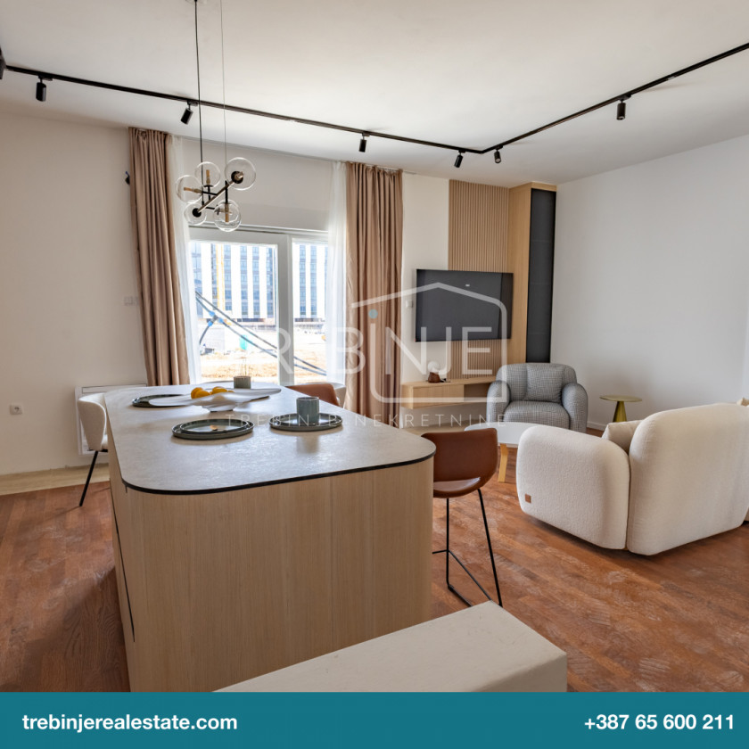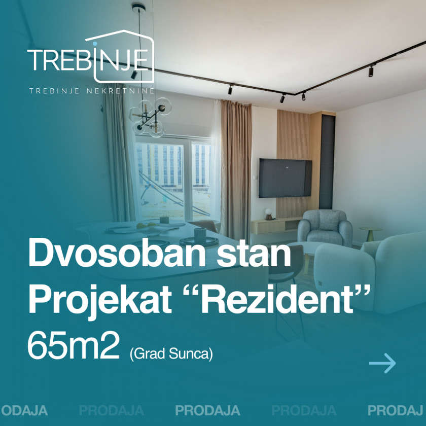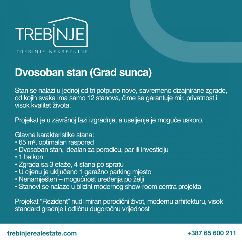 Prodaje se moderan dvosoban stan od 65 m² u okviru prestižnog projekta “Rezident”, koji se nalazi u sklopu kompleksa Grad Sunca, jedne od najpoželjnijih lokacija za porodični život u Trebinju.
