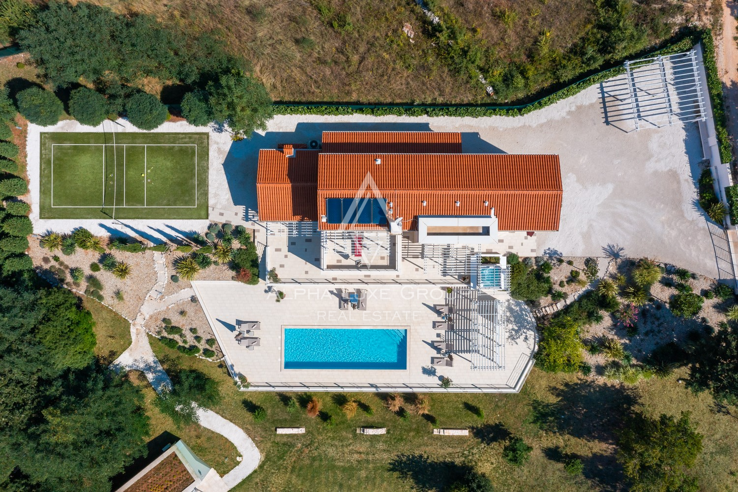 Opis: Smještena na prostranoj parceli od 1.850 m² u blizini Svetvinčenta, ova elegantna vila pruža luksuzan spoj udobnosti, privatnosti i modernog mediteranskog života. Prostire se na 254 m² kroz dvije etaže, a raspored je promišljeno osmišljen kako bi pružio mnogo prostora za opuštanje i udoban boravak. Prizemlje se otvara privlačnim ulaznim hodnikom koji vodi u vinski podrum, spremište, praonicu, suvremenu kuhinju i blagovaonicu povezanu s otvorenim dnevnim boravkom. Iz dnevnog boravka vodi izlaz na natkrivenu terasu opremljenu kamenim roštiljem i velikim granitnim stolom za dvanaest osoba—savršeno za objedovanje na otvorenom i druženja.