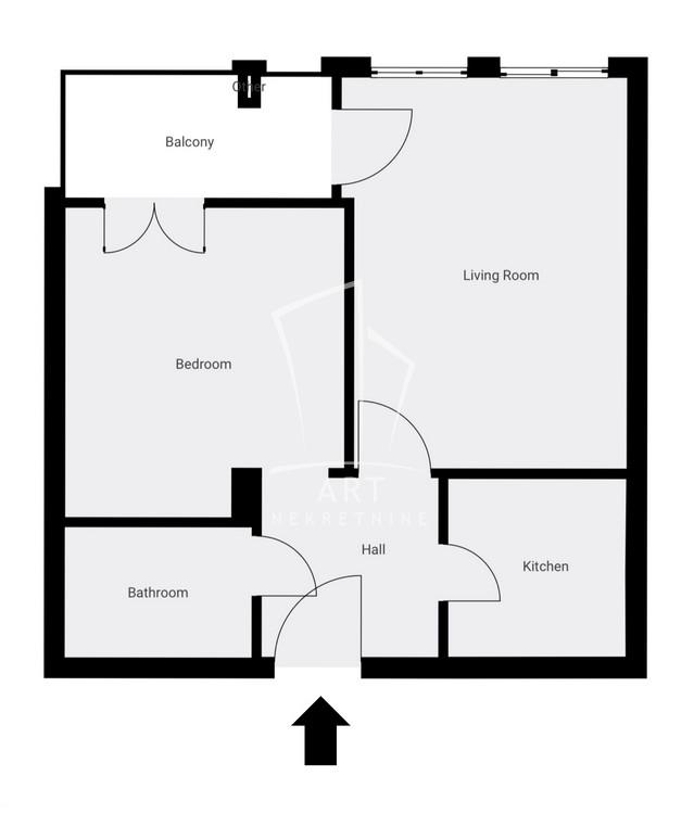 ulazni antre, dnevna soba sa trpezarijom i kuhinjom (otvoren koncept), prostrana spavaća soba, kupatilo i lođa (izlazi iz spavaće sobe i iz dnevnog boravka).