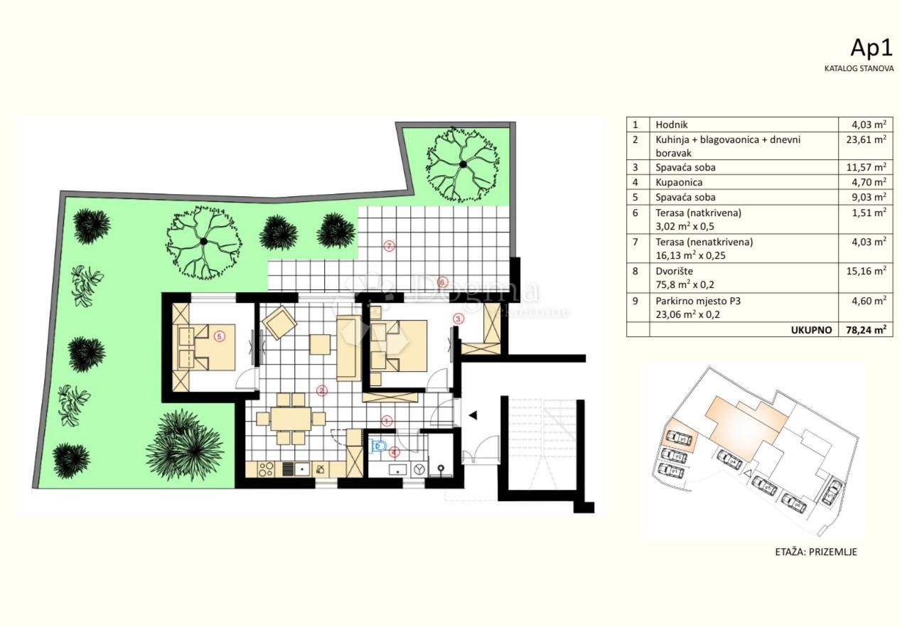 Ukupna korisna površina stana iznosi 78,24 m², uključujući natkrivenu i nenatkrivenu terasu te pripadajući vlastiti vrt površine 75,80 m². Stanu pripada i jedno parkirno mjesto (oznaka P3) površine 23,06 m².