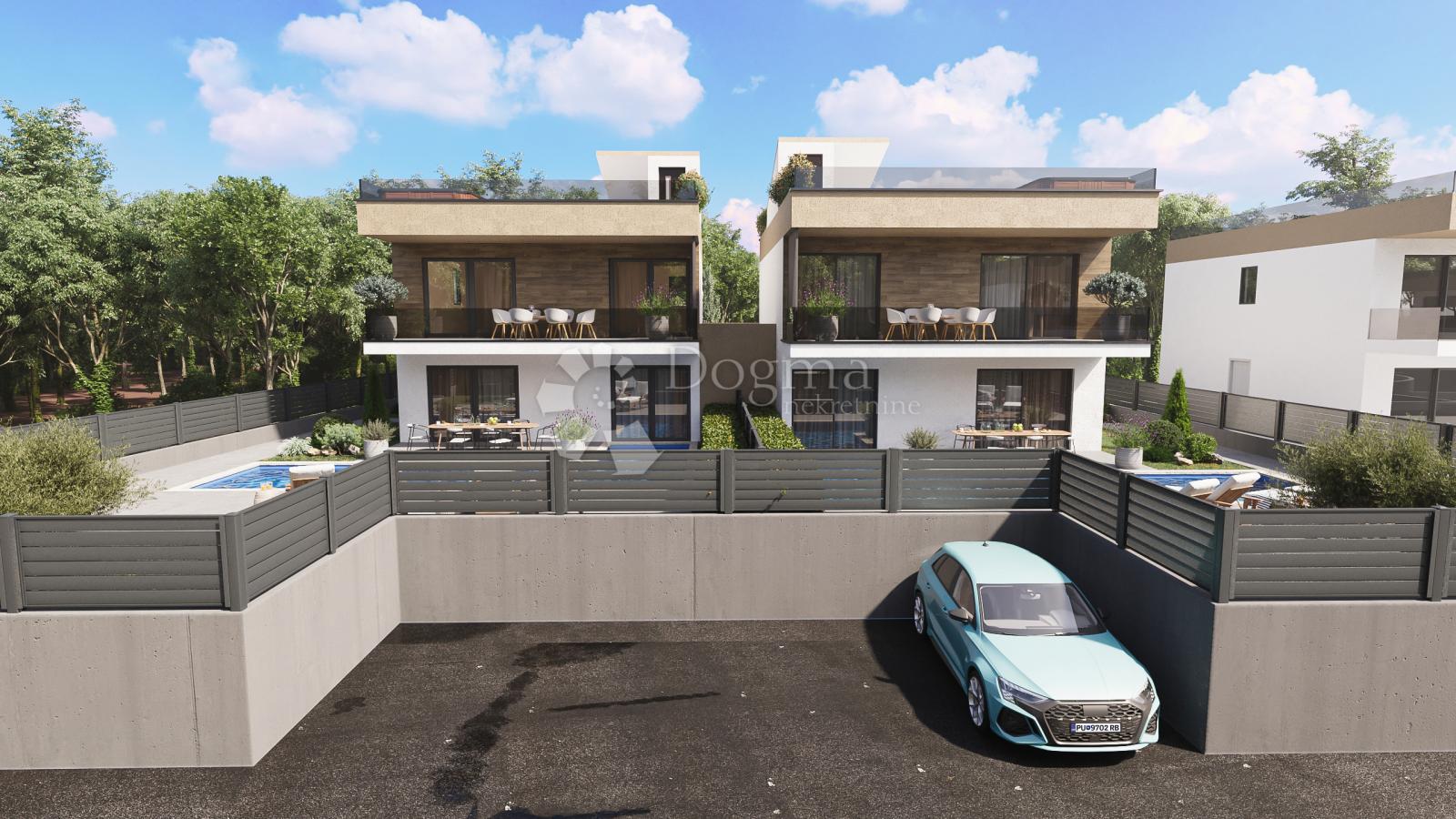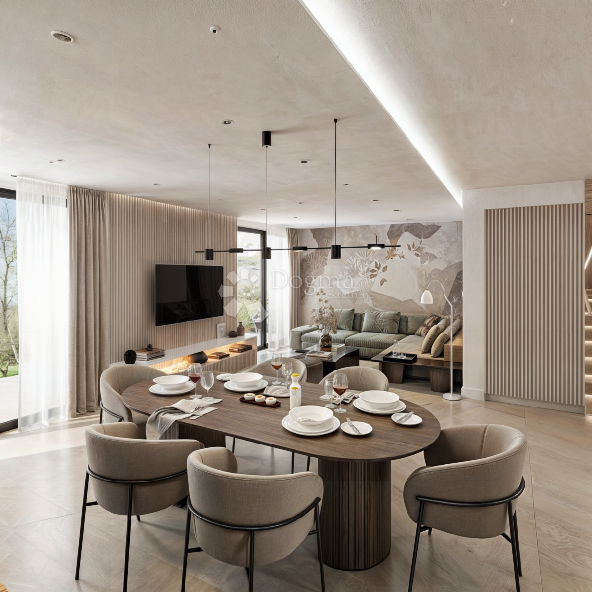 U prizemlju kuće smješten je prostrani dnevni boravak s kuhinjom i blagovaonicom otvorenog tipa, koji nudi puno svjetla i udobnosti. Također, tu je spremište te WC za goste. Iz dnevnog boravka izlazi se na prostranu natkrivenu terasu od 18 m², koja vodi do uređene okućnice s bazenom i sunčalištem, savršenim za uživanje u sunčanim danima.