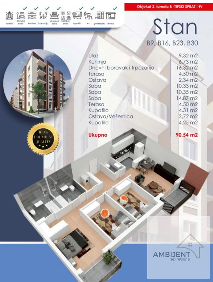 Stan ima 90.54m2, a čine ga dnevna soba sa kuhinjom i trpezarijom, hodnik, tri spavaće sobe od kojih je jedna master sa sopstvenim kupatilom i delom za garderobu, vešernica, wc, još jedno kupatilo i dve terase.
