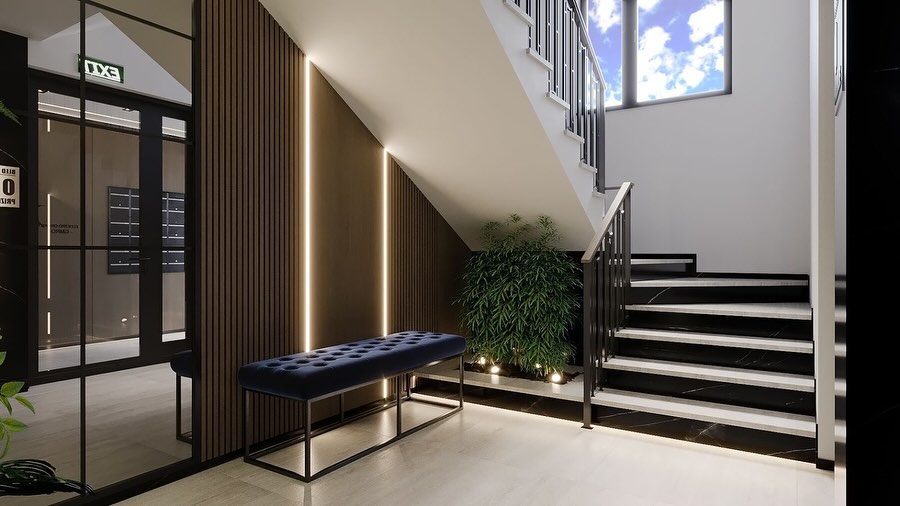 * 🏛️ Moderan ulaz i hodnici (staklene stijene, LED rasvjeta, dekor paneli)