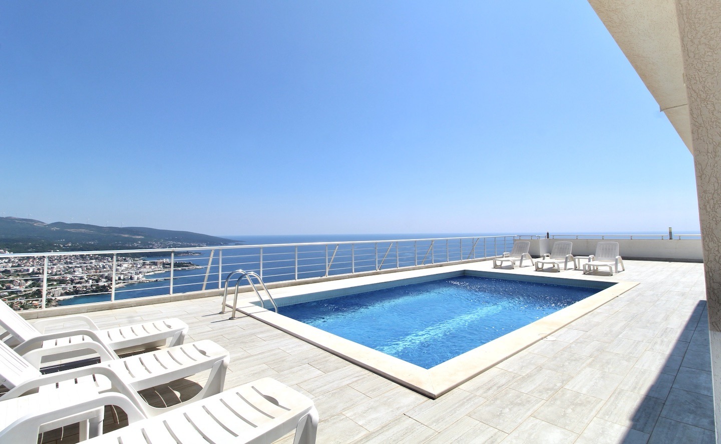 Opis: This is a two bedroom apt situated in Kalamper Vista Complex in the hills of Dobra Voda. Apt has huge terrace that has an amazing view of Adriatic Sea, Dobra Voda Coast and surrounding hills and mountains. You will love this apt because of it’s views, terrace, big windows, modern furniture, stylish interior, comfy ambiance and fresh air. Apt can fit 6 people, 2 in 1st bedroom, 2 in 2nd bedroom and 2 in the living room where couch pulls out. Apt has access to the rooftop shared pool and lounge chairs.