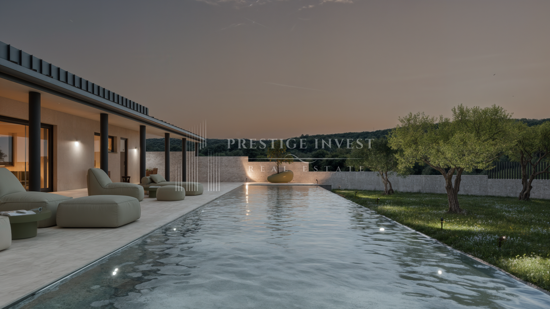 Na prodaju je ekskluzivna luksuzna vila smještena na jednoj od najpoželjnijih lokacija u Istri – Kaštelu kraj Buja. Ova moderna prizemnica južne orijentacije pruža savršenu privatnost, mir i otvoreni panoramski pogled na pitoreskni istarski pejzaž, grad Buje te netaknutu prirodu okruženu maslinicima.