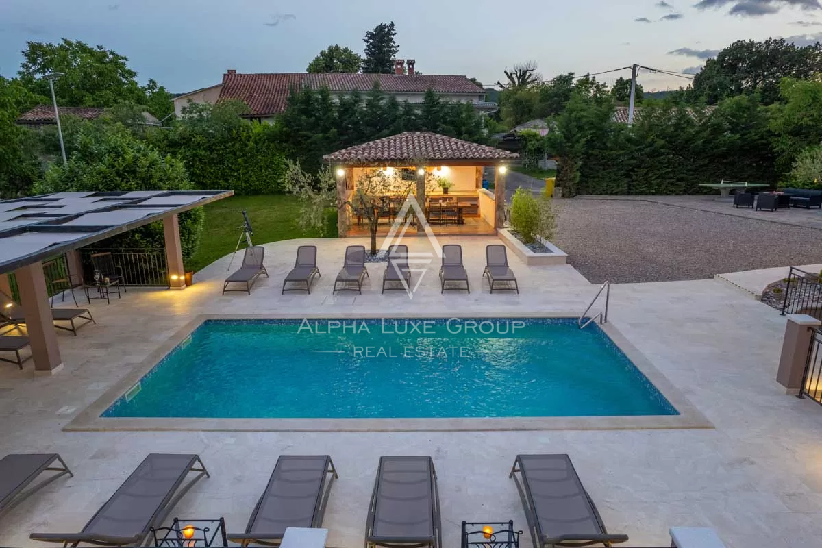 Opis: Smješteno u mirnom središtu Istre, ovo prostrano imanje na prodaju u blizini Pićna predstavlja rijetku kombinaciju potpunog privatnog ambijenta, šarma i raznovrsnih mogućnosti korištenja. Na prekrasno uređenoj parceli od 4.500 m² nalaze se tri samostalne vile, veliki bazen te bogat izbor vanjskih sadržaja, uključujući profesionalni teniski teren u punoj veličini. Pozicionirano na blagom brežuljku, u neposrednoj blizini jednog od najautentičnijih istarskih kamenih sela, ovo imanje nudi opuštajući bijeg okružen netaknutom prirodom.