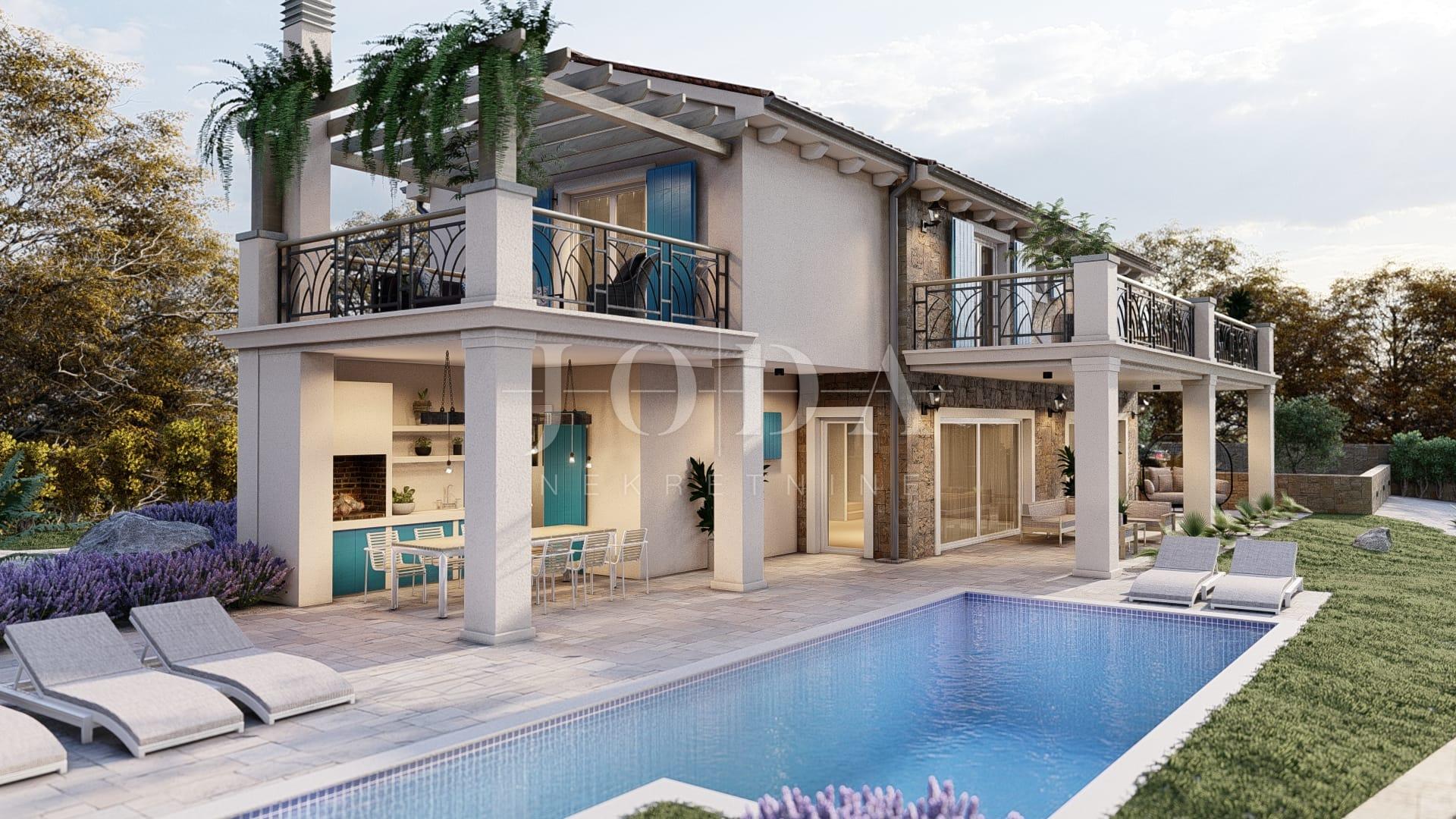 Nekretnina je projektirana kao skladan spoj tradicionalnih elemenata i suvremenog dizajna, uz visoku kvalitetu gradnje i promišljenu organizaciju prostora. Kuća je djelomično obložena kamenom, s rustikalnim plavim škurama koje se vizualno uklapaju u mediteranski ambijent. Proteže se kroz dvije etaže funkcionalnog rasporeda.