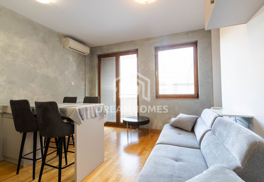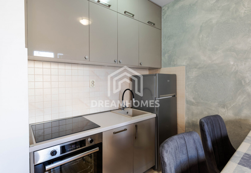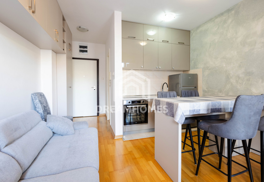 Garsonjera se sastoji od jedne veće prostorije sa dvosjedom, šankom koji odvaja trpezarijski dio, kuhinje, hodnika sa ugradnim ormarima, kupatila i terase. Prostor je svijetao, uredan i dobro održavan, što omogućava udoban boravak bez dodatnih ulaganja.