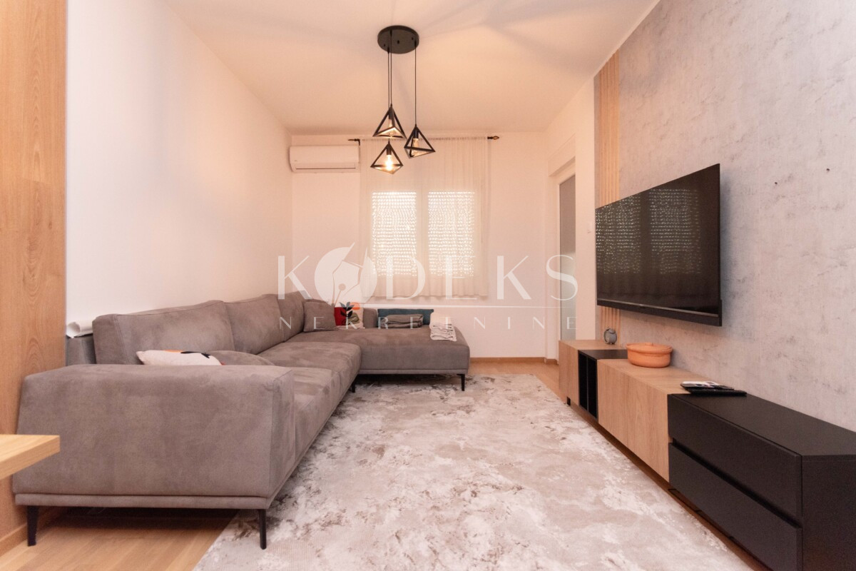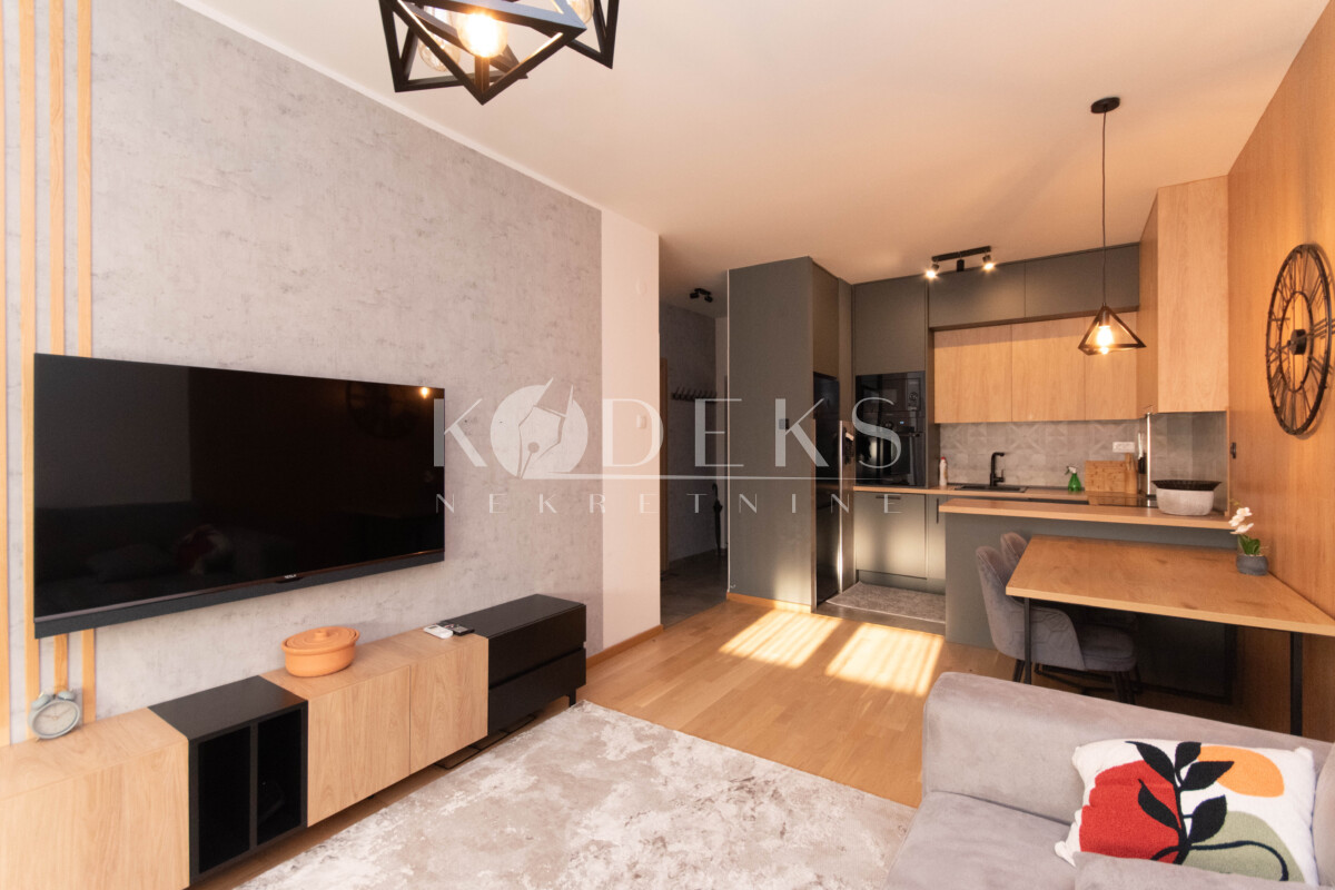 Struktura: Dnevna soba koja je povezana sa kuhinjom i trpezarijom i ima izlaz na terasu, spavaća soba koja takođe ima izlaz na terasu, ulazni hodnik i kupatilo.