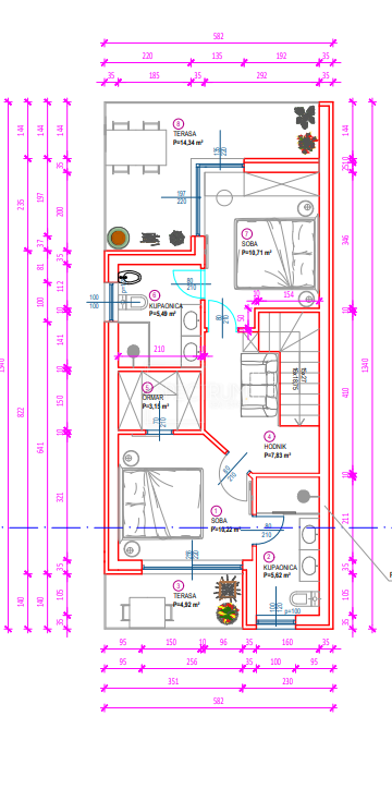 Površina kuće iznosi 118.18 m2, a kuća se proteže na prizemlje i kat. U prizemlju se nalazi ulazni hodnik, dnevni boravak sa kuhinjom i blagovaonicom open space koncepta, spavaća soba sa vlastitom kupaonicom, gostinjski wc i praonica. Unutarnjim stepenicama se dolazi do kata gdje se nalazi hodnik te 2 spavaće sobe, svaka sa svojom kupaonicom i svaka sa svojom terasom. Sa jedne terase se pruža pogled na prirodu i na more.
