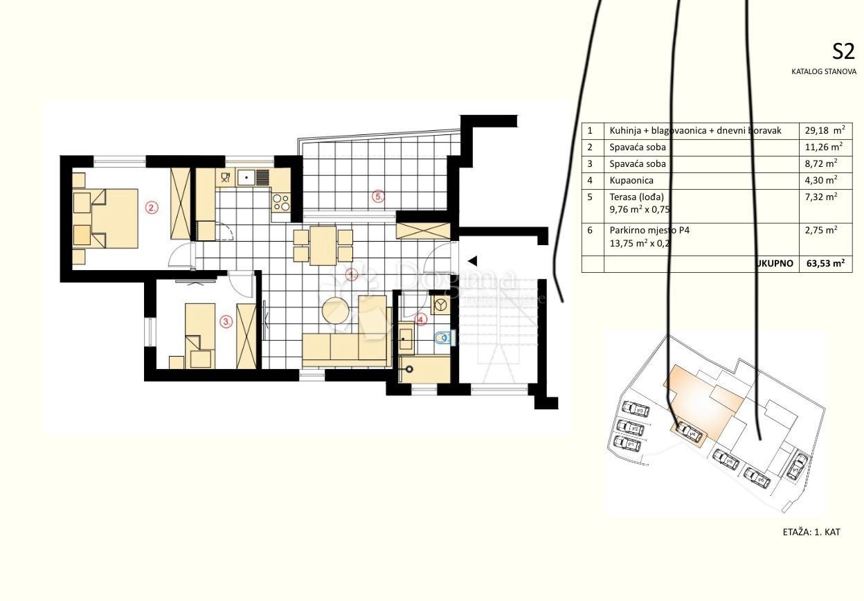 Na prodaju je moderno uređen stan S2 smješten na prvom katu manje stambene zgrade, ukupne površine 63,22 m² (zatvoreni dio, terasa i parkirno mjesto). Stan se nalazi u mirnom okruženju, na svega 580 m od mora i centra Murtera, te nudi idealnu kombinaciju komfora, praktičnosti i ugodnog ambijenta.