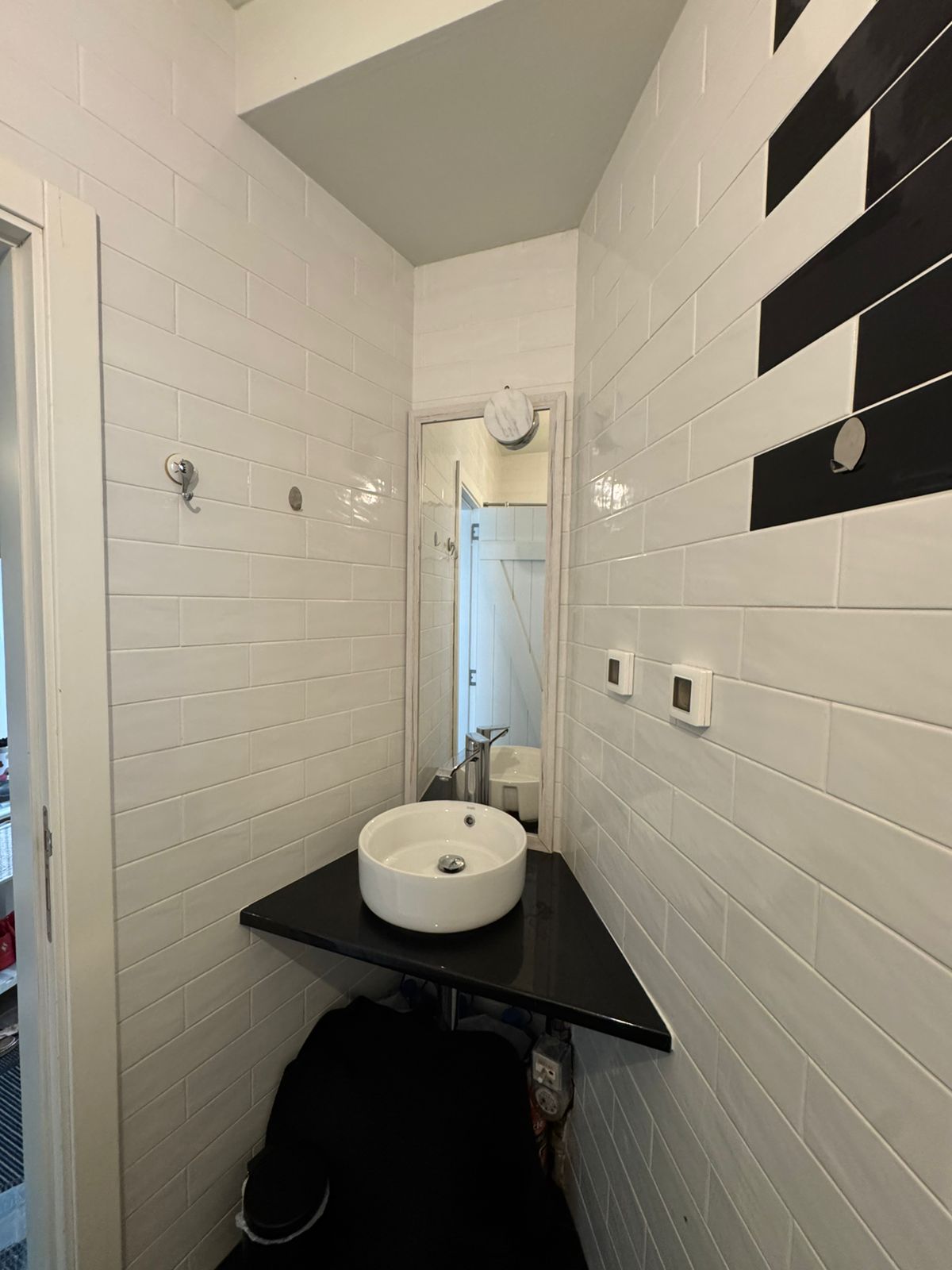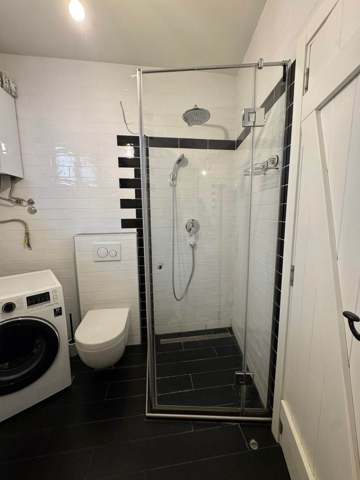 Iz ulaznog dijela desno se ulazi u kuhinju, a lijevo u svijetlo kupatilo opremljeno umivaonikom, tušem, WC-om i mašinom za veš.