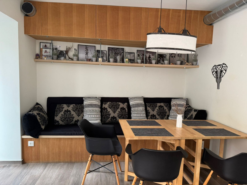 Udoban dnevni boravak impresionira prijatnom zonom za sjedenje, kamin peći koja pruža dodatnu toplinu, kao i klima-uređajem za hlađenje i grijanje. Pored se nalazi trpezarijski prostor, dok velika staklena stijena koja vodi direktno na patio stvara svijetlu i toplu atmosferu.