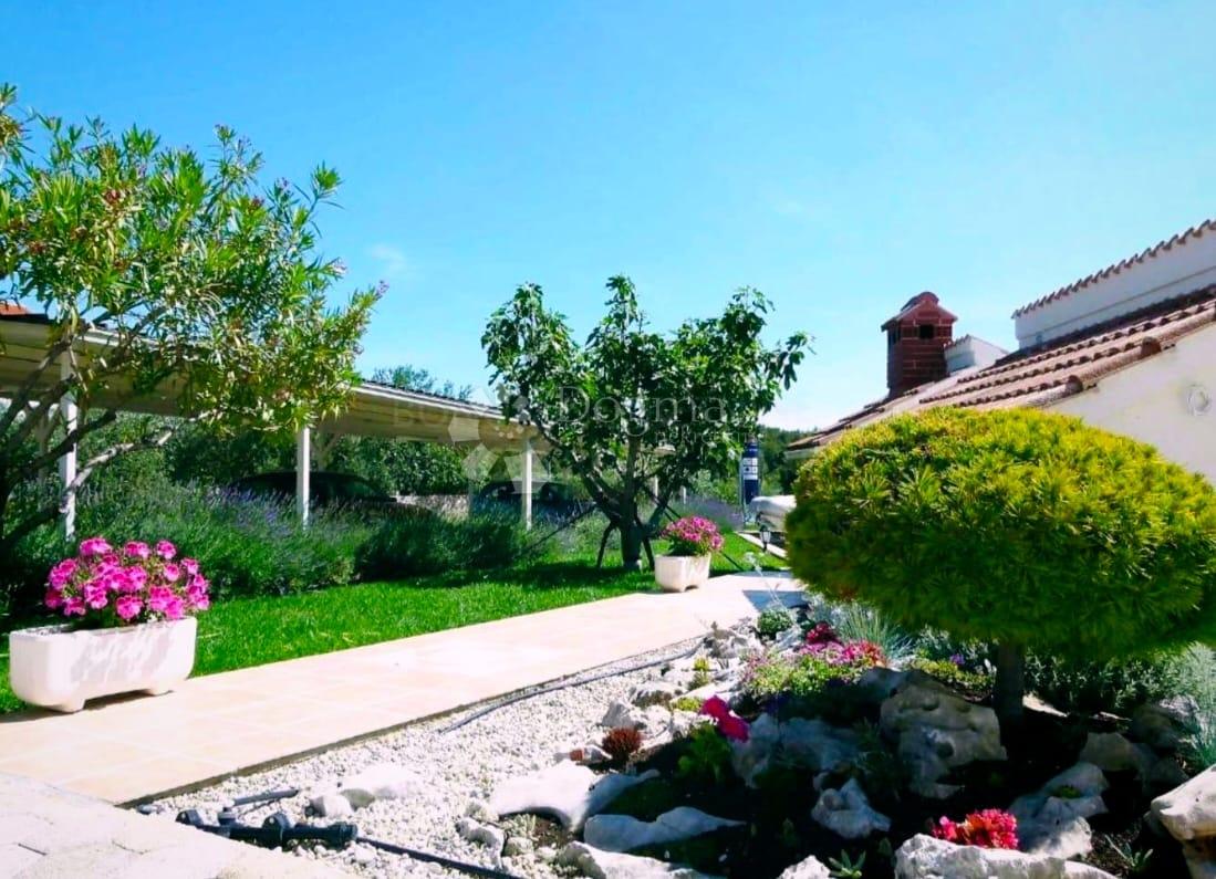 Kuću okružuje prekrasno uređena okućnica s velikim bazenom, natkrivenom sjenicom, ljetnom kuhinjom i roštiljem, stvarajući savršeno mjesto za opuštanje i uživanje u mediteranskom ambijentu.