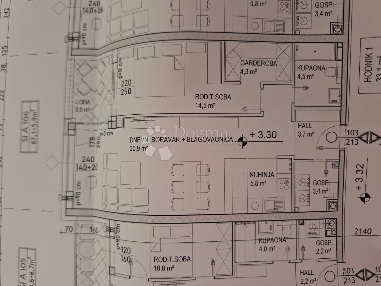 Stambena jedinica SJ A 106 na prodaju nalazi se na prvom katu te se sastoji od ulaznog prostora, gospodarske sobe, kupaonice, kuhinje, prostranog dnevnog boravka te blagovaonice otvorenog tlocrta te izlaza na lođu, te spavaće sobe s garderobom koja također ima izlaz na vanjski prostor. Neto stambena površina stana je 67,1 m2, a lođa je ukupne površine (bez koeficijenta) 5,9 m2. Zasebno se kupuje parkirno mjesto (vanjsko ili garažno) te spremište u podrumu.