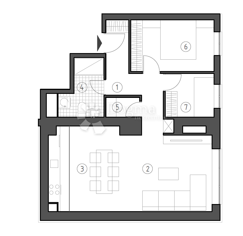Stan se sastoji od dvije spavaće sobe, kupaonice, dnevnog boravka, kuhinje i blagavaonice te spreme.