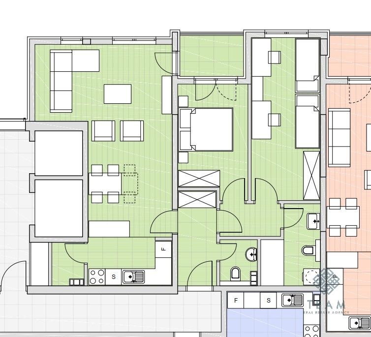 Stan je pažljivo projektovan tako da kombinuje moderan dizajn, funkcionalnost i vrhunski komfor. Sastoji se od prostranog dnevnog boravka sa kuhinjom i trpezarijom, dvije spavaće sobe, kupatila, toaleta, predsoblja i terase.