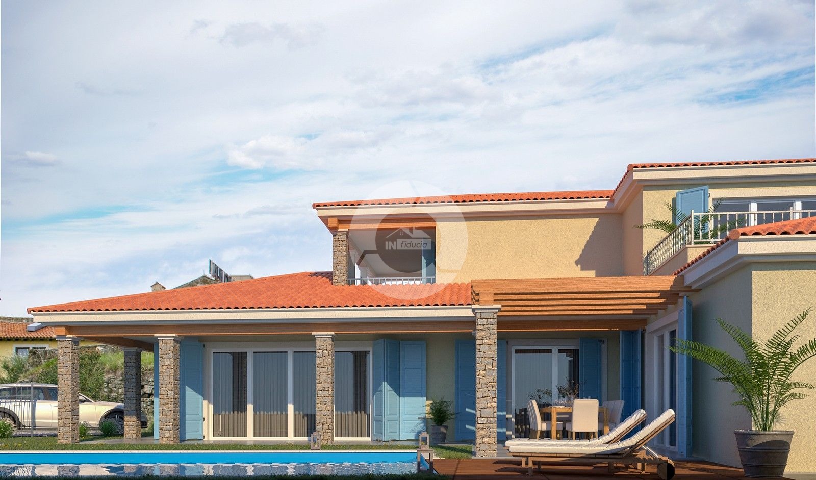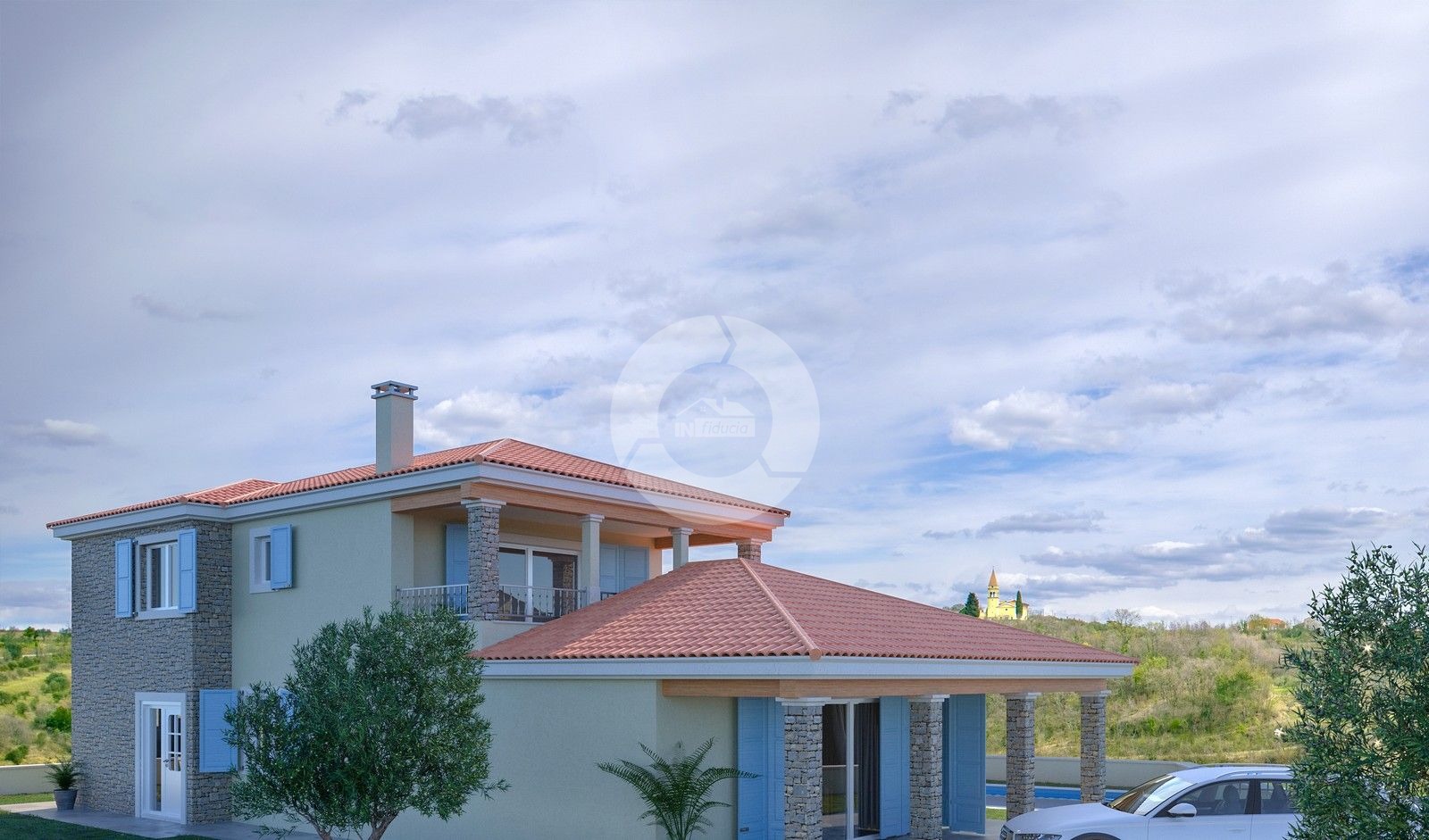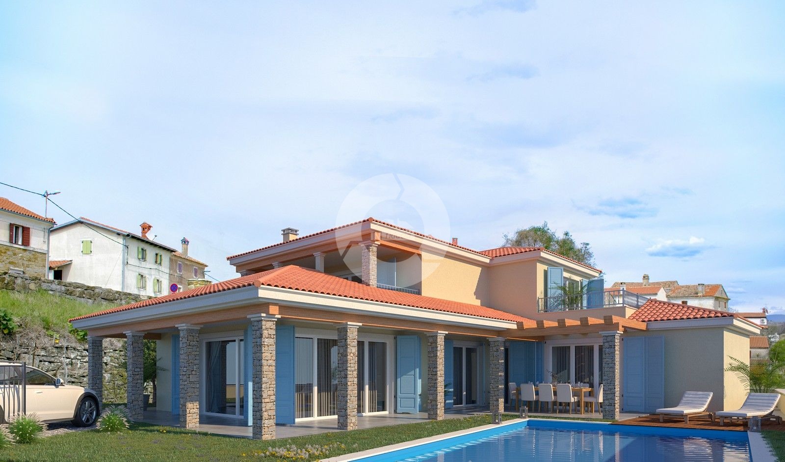 Opis: Kuća s bazenom nalazit će se u jednom tipičnom istarskom gradiću nedaleko od Buja. Okružena je poljoprivrednim zemljištem, maslinicima, lokacija je izuzetno mirna. Sastoji se od prizemlja i kata. U priizemlju se nalazi dhodnik, garderoba, wc, spavaća soba, kupaona, kuhinja, blagovaona, dnevni boravak sa izlaskom na terasu i bazen. U prizemlju ima još jedan ljetna kuhinja. Na katu se nalaze dvije spavaće sobe, svaka sa svojom kupaonom i terasom. Sa terase se pruća otvoreni pogled na more i prirodu. Idealan je izbor kao kuća za odmor ili kao obiteljska kuća.