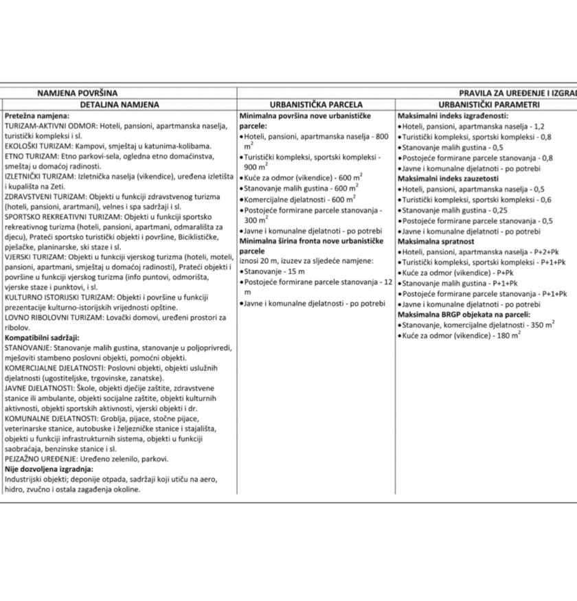 • Kuće za odmor (vikendice) – minimalna površina: 600 m²