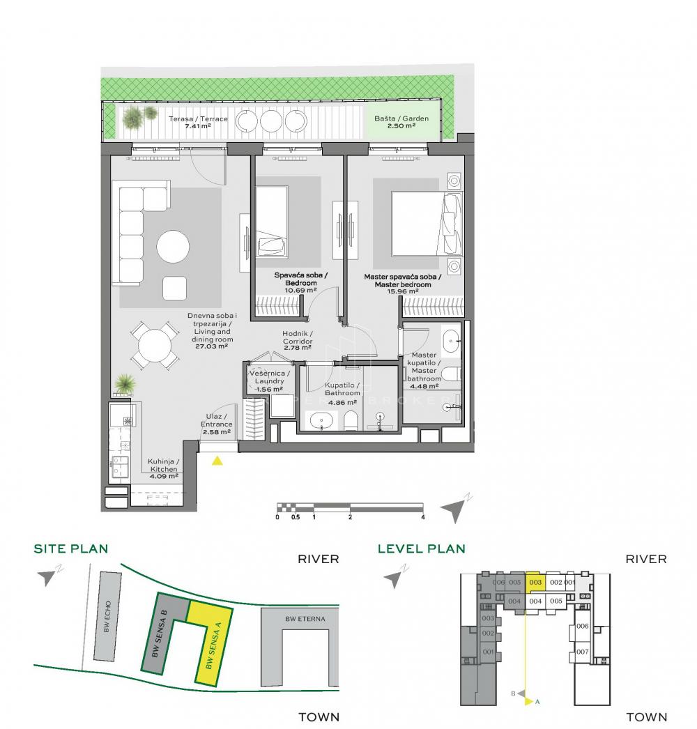 Opis: BW Sensa-nudimo veliki i prostran stan na prizemlju sa privatnom baštom, idealan za poslovni ili stambeni prostor. Sastoji se od: ulaznog hodnika, velikog dnevnog boravka sa trpezarijom i kuhinjom, direktnog izlaza na terasu, spavaće sobe, master spavaće sobe sa sopstvenim kupatilom, vešernice i još jednog kupatila. Stanu pripada terasa od 7 m2 i deo travnjaka-bašte od 2.5 m2. Izuzetno dobro pozicioniran za sve vrste poslovnih potreba, jer ima vidljivost sa ulice, u nivou lokala.