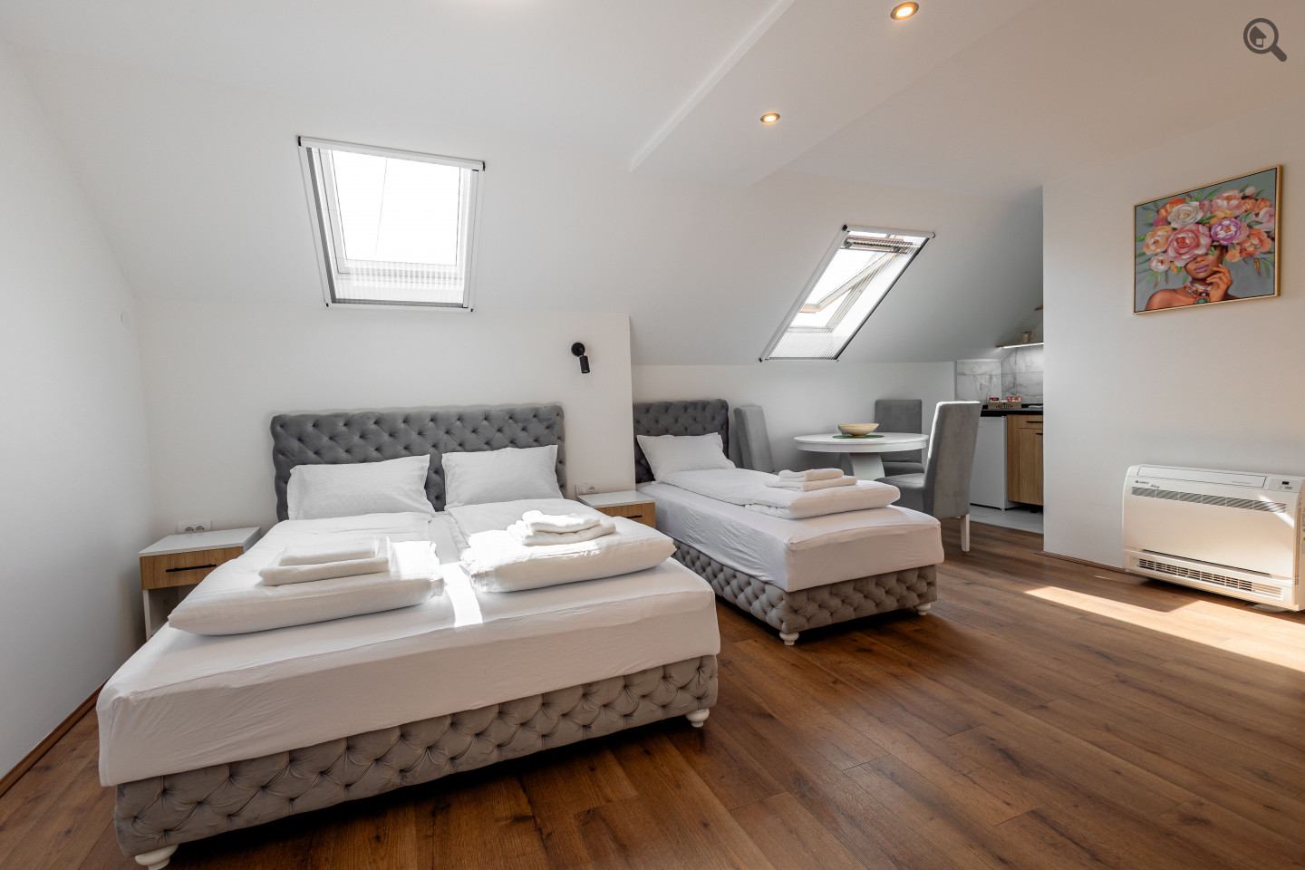 Opis: Studio apartman Luna Nera 5 se nalazi u mirnom delu Novog Sada, u naselju Salajka, na adresi: Jovana Cvijica 28. Smešten je na1. spratu privatne kuće u kojoj se nalazi još 8 apartmana što je odlična pogodnost za sve goste koji žele da budu smešteni na istoj lokaciji. Apartman Luna Nera 5 je površine od 30m2 i namenjen je za 3 osobe. Sastoji se od jedne prostorije u kojoj se nalazi jedan bračni krevet koji je namenjen za 2 osobe i pored toga, jedan singl krevet. Kompletno opremljena čajna kuhinja koja je prilagodjena kako za kraći, tako i za duži boravak u apartmanu. Kupatilo sa tušem. Od dodatnog sadržaja, gostima je na raspolaganju besplatan WiFi internet, LCD TV sa kablovskim kanalima, čisti peškiri i čista posteljina. Postoji opcija dnevnog odmora u terminu od 11.30-14.30h i cena je 25 evra. Besplatan privatni parking sa video nadzorom je obezbedjen svim gostima apartmana. NAPOMENA: Cene i uslovi zakupa se razlikuju u periodu EXIT festivala. Minimalan zakup je 2 noći i cena je 130e po danu. Dobrodošli!