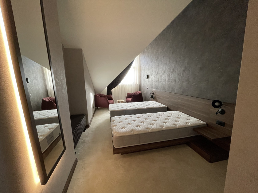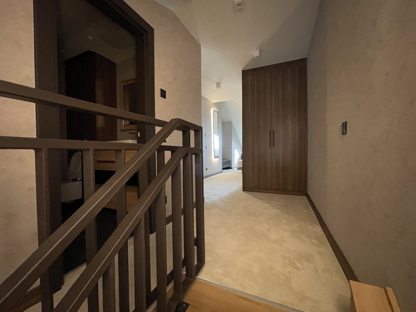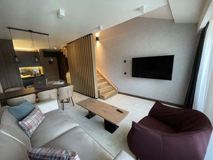 Apartman se nalazi na trećoj etaži sa galerijom u nivou potkrovlja. Komforan, funkcionalnog rasporeda i prelepim pogledom na planinske vrhove kao i kompletno opremljeni enterijer i pristup svim sadržajima.