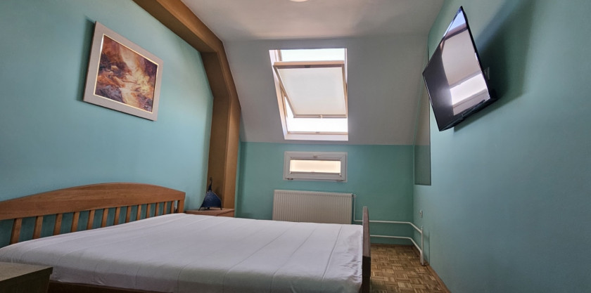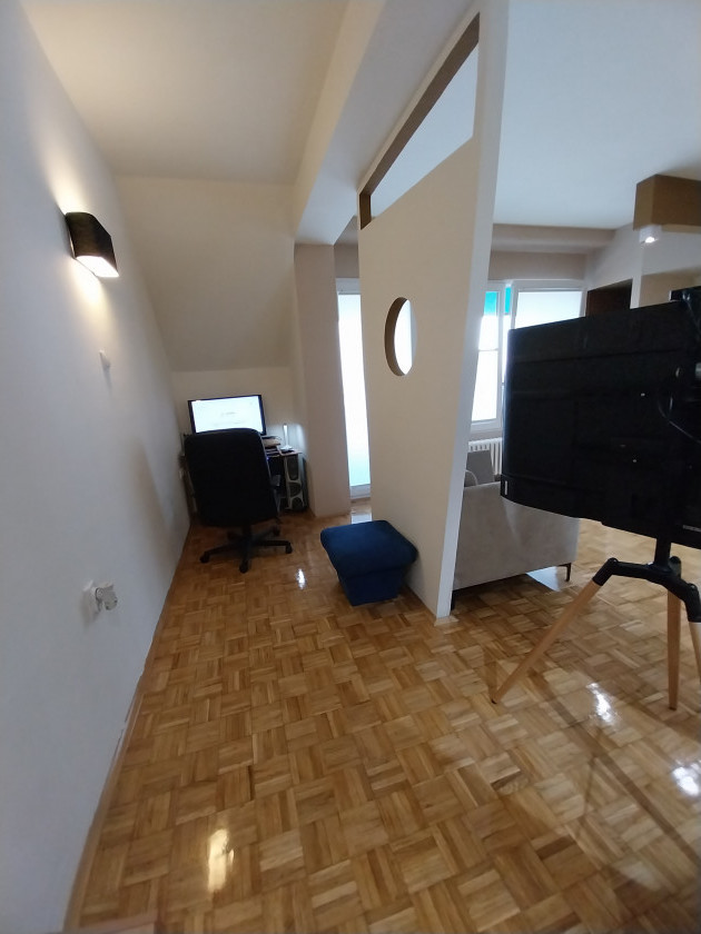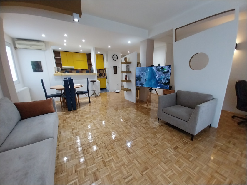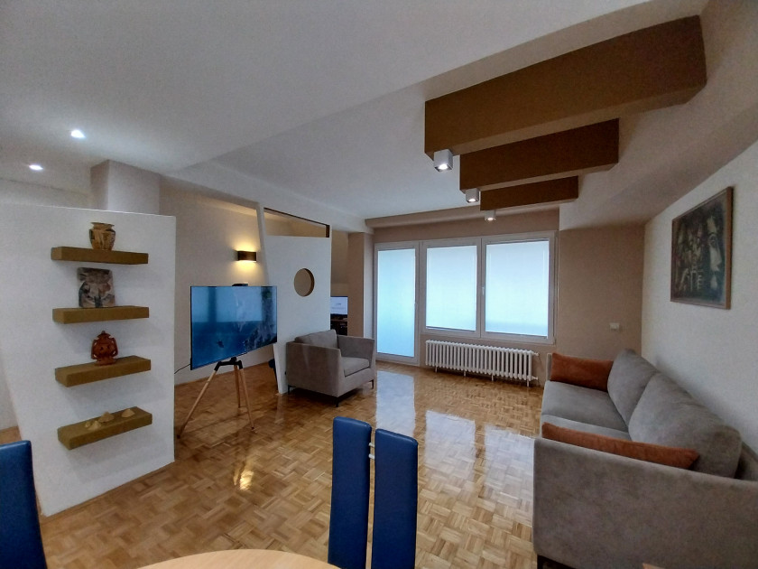 Opis: U blizini crkve i marketa nalazi se kompletno, moderno renoviran stan. Stan se sastoji od prostranog dnevnog boravka sa terasom, kuhinjom i trpezarijom, spavace sobe i kupatila. Stan se prodaje sa namestajem i tehnikom. Zgrada je povucena od ulice, sredjena, sa parking prostorom ispred zgrade, nema lift.