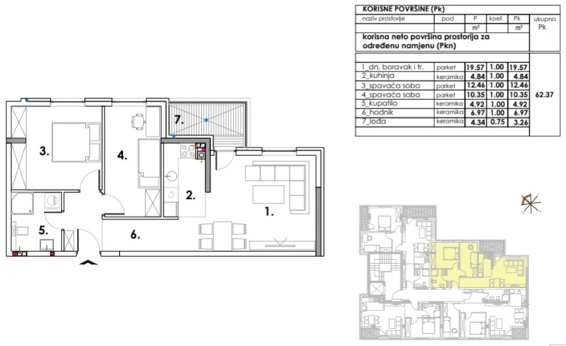 STRUKTURA: dnevni boravak sa kuhinjom i sa izlazom na lođu, spavaća soba, dječija soba, hodnik i kupatilo.