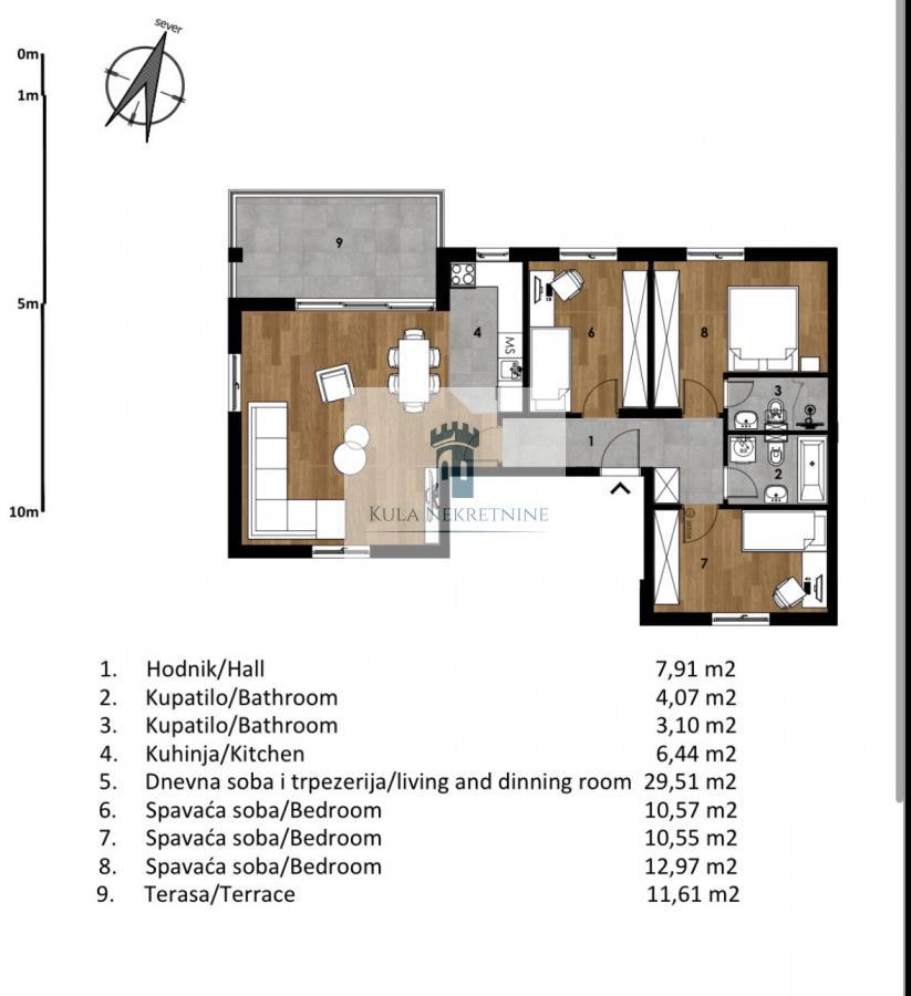 Strukturu stana čine predsoblje, dva kupatila, dnevni boravak sa kuhinjom i terasom, i tri spavaće sobe. U svaku od prostorija se ulazi iz hodnika.