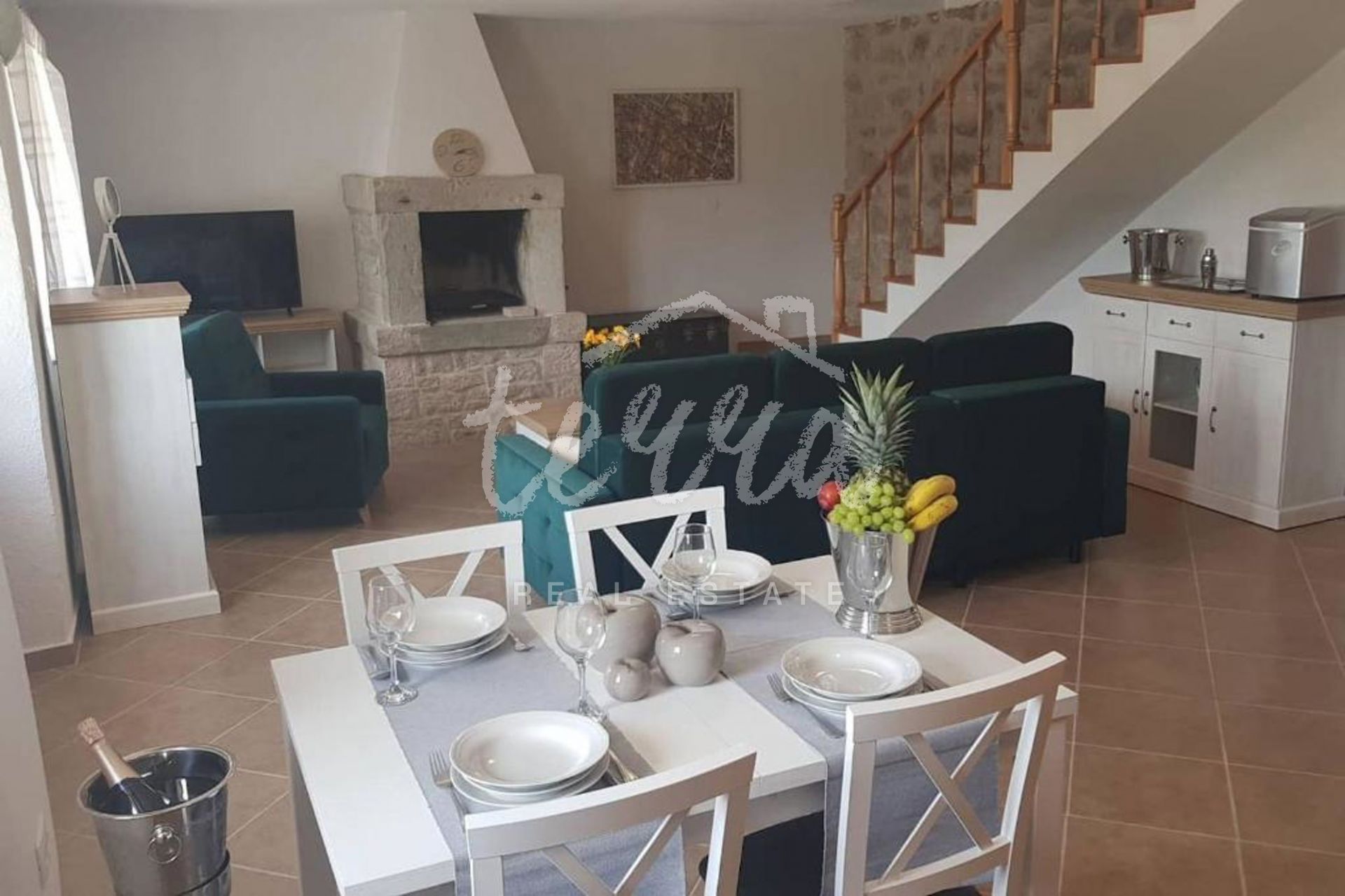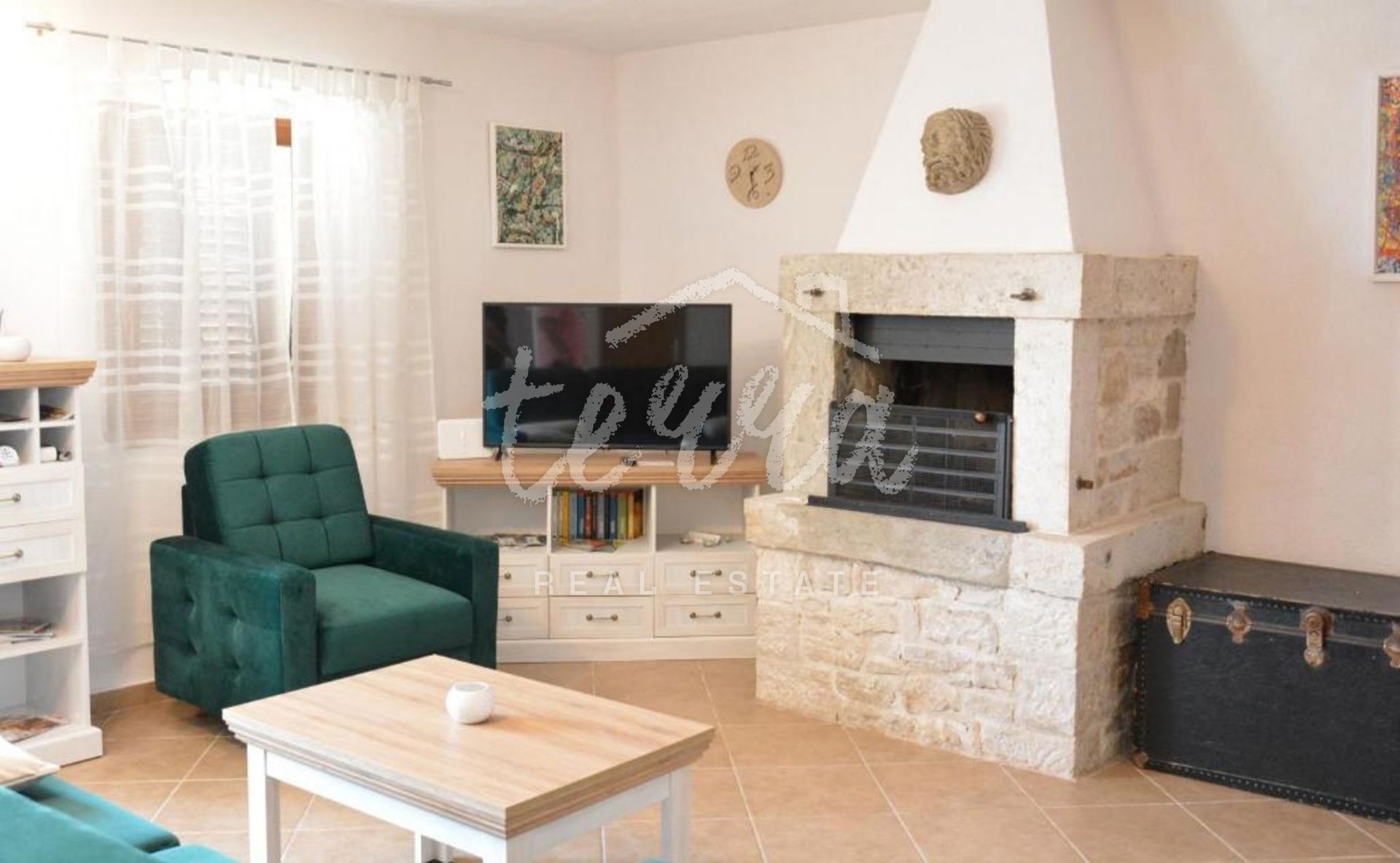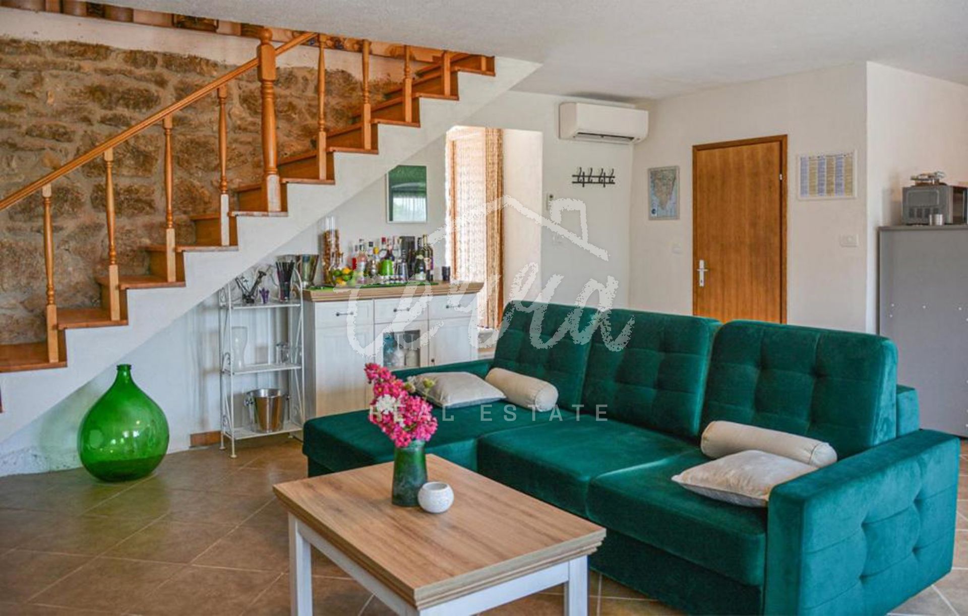 Ulaskom u kuću dočekuje vas ugodno uređen prostor koji spaja toplinu doma s jednostavnošću svakodnevnog života. Prostrani dnevni boravak nudi udobnost zahvaljujući pažljivo odabranom namještaju, a u središtu se nalazi kamin koji unosi poseban ugođaj u prostor.
