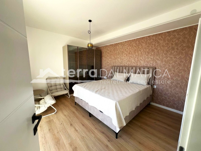 Opis: Prodaje se nova, namještena dvojna kuća u Srimi kod Vodica s pogledom na more. Smještena je samo 300 metara od plaže, u mirnom i uređenom dijelu mjesta. Ukupna površina iznosi 168,42 m², od čega je stambeni dio 121 m², uz terase od ukupno 46,91 m², te vrt i dva parkirna mjesta. Proteže se na tri etaže, s elegantnim ulazom, ostavom, praonicom, wc-om te prostorom kuhinje, blagovaonice i dnevnog boravka koji izlazi na terasu od 18 m². Na prvom katu nalaze se hodnik i dvije spavaće sobe, svaka sa svojom kupaonicom i zajedničkom terasom, dok zadnji kat donosi dodatnu privatnost s hodnikom, kupaonicom i trećom spavaćom sobom koja ima izlaz na terasu od 17,31 m². Kuća je građena vrhunskim materijalima: stiropor fasada 10 cm, protuprovalna i protupožarna vrata, ALU stolarija, podizne klizne stijene, električne rolete i komarnici, podno vodeno grijanje, solarni paneli, klima uređaji, moderne sanitarije, kvalitetan laminat, staklena ograda i električne pergole. Prodaje se potpuno namještena i spremna za useljenje. Srima je divno obalno mjesto, poznato po čistom moru, lijepim šetnicama i opuštenom načinu života, a istovremeno je blizu živahnih Vodica i svih potrebnih sadržaja....