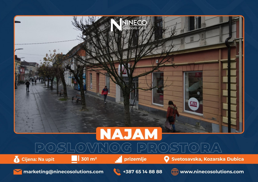 Iznajmljuje se poslovni prostor u centru Kozarske Dubice, u glavnoj Svetosavskoj ulici, idealan za različite poslovne djelatnosti.