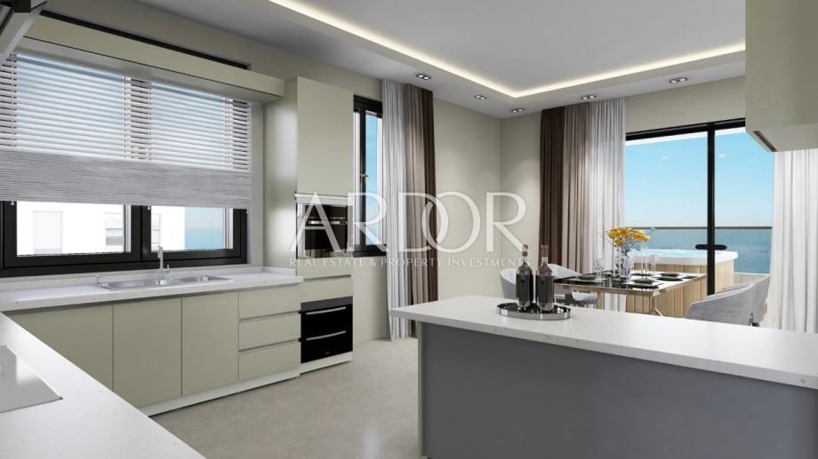 Opis: Otok Rab, Banjol, prodaje se ekskluzivni penthouse na drugom katu moderne zgrade, površine 134 m², s velikom terasom opremljenom jacuzzijem, roštiljem i lounge zonom, dijelom natkrivenom, dijelom otvorenom, s panoramskim pogledom na more, otoke Pag i Cres te grad Rab. Stan se sastoji od prostrane dnevne sobe s kuhinjom i blagovaonicom, kuhinjskog otoka, dvije kupaonice, od kojih je jedna unutar master spavaće sobe, i dvije spavaće sobe. Svakom stanu pripadaju dva privatna parkirna mjesta. PVC antracit stolarija, komarnici i elektrorolete osiguravaju moderan izgled i udobnost. Nekretnina je smještena u mirnom okruženju maslinika, 5 minuta od mora i 5 minuta automobilom od starog grada Raba, s mogućnošću pješačenja od 20 minuta ili taxi brodom za 10 minuta. Cijena je početna i vrijedi za ranu fazu prodaje uz mogućnost prilagodbe unutarnjeg uređenja.