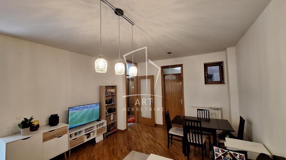Po strukturi dvosoban,spavaća soba,dnevna sa trpezarijom,toalet i terasa.