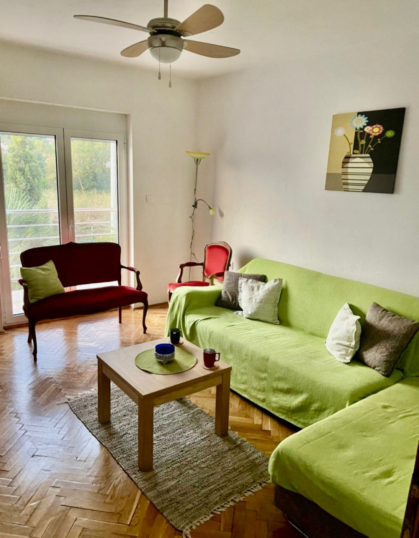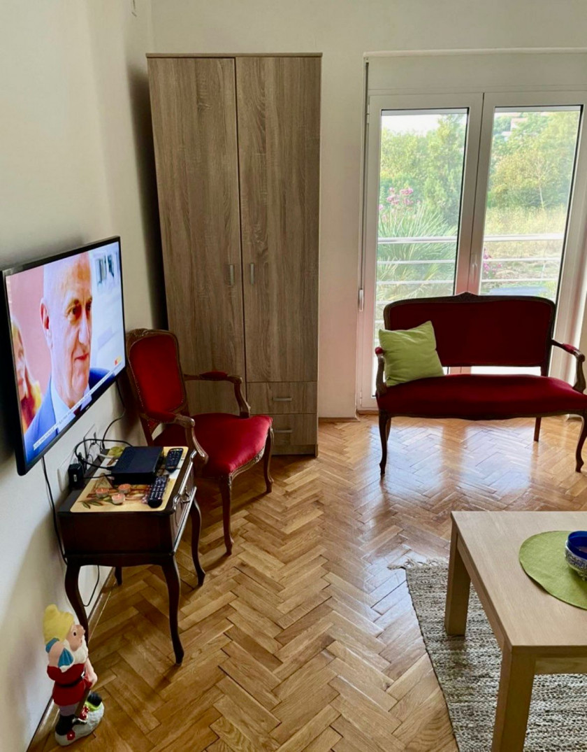 Sunčano. Zeleno dvorište od 537 m² (koje dijele vlasnici dva stana). Mirna, ugodna ulica.