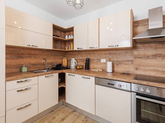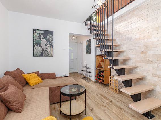 Spoljašnje stepenište. Na drugom spratu se nalazi ulazni hol, kupatilo, dve spavaće sobe, dnevna soba, kuhinja sa trpezarijom i prostrana terasa. Unutrašnje stepenište. Na trećem spratu se nalaze dnevna soba, spavaća soba, kupatilo i prostrana terasa.