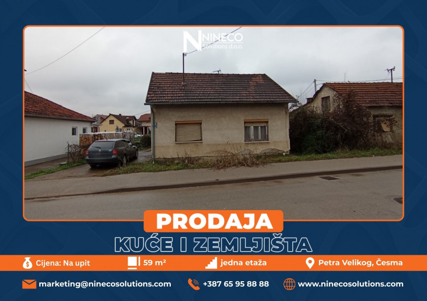 Na prodaju kuća površine 59 m² sa pomoćnim objektom od 45 m², smještena na ravnoj, pravougaonoj parceli ukupne površine 1.300 m² (dimenzije cca 15 x 85 m). Parcela se sastoji od dvije međusobno povezane parcele, koje zajedno čine funkcionalnu cjelinu idealnu za različite namjene.