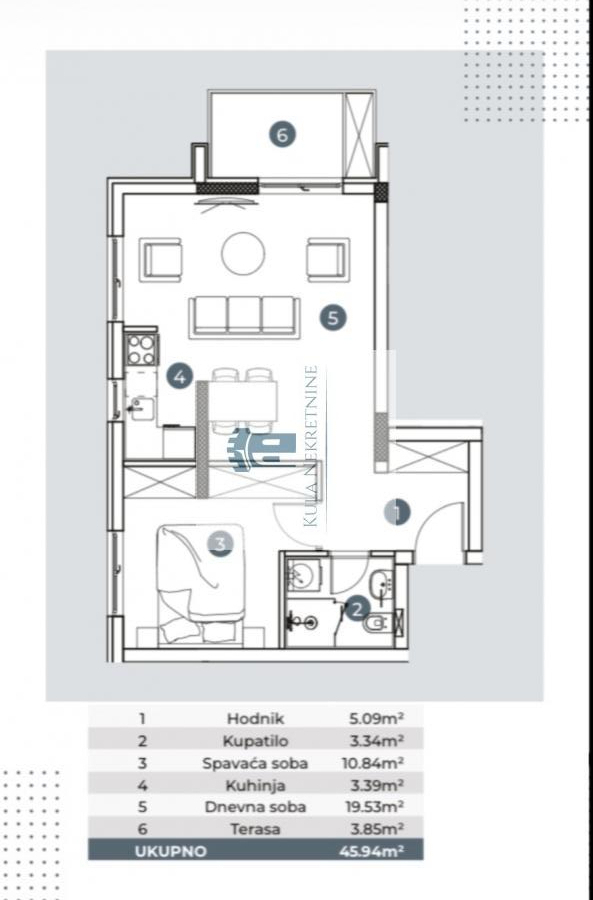 Strukturu stana čine predsoblje, prostran dnevni boravak sa izlazom na terasu, kuhinja, kupatilo i spavaća soba.