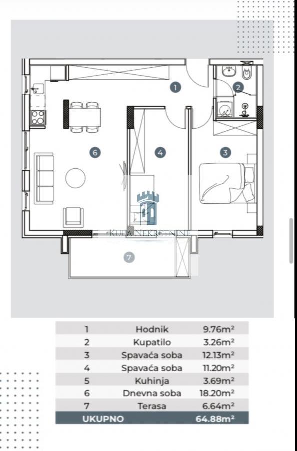 Nekretnina se nalazi na četvrtom spratu (nije poslednji) u zgradi sa liftom. Strukturu stana čine predsoblje, dnevni boravak sa izlazom na terasu, kuhinja, dve spavaće sobe i kupatilo.