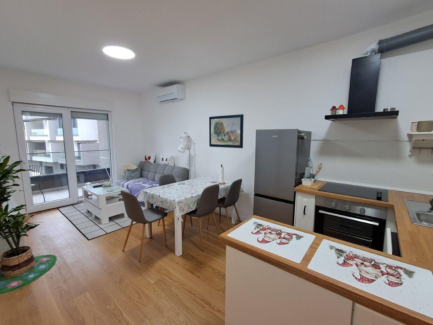 Sastoji se od kuhinje s trpezarijom i dnevnog boravka, dvije spavaće sobe, kupatila i lođe. Jedna spavaća soba trenutno je opremljena kao radna ali u slučaju potrebe dodatnog kreveta, vlasnik će ga kupiti.