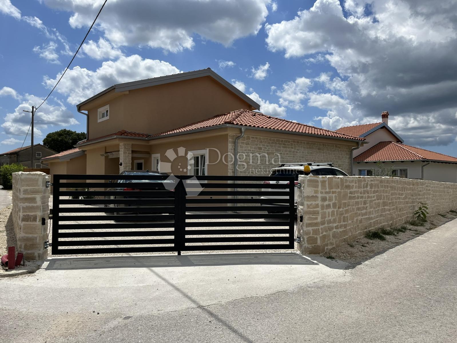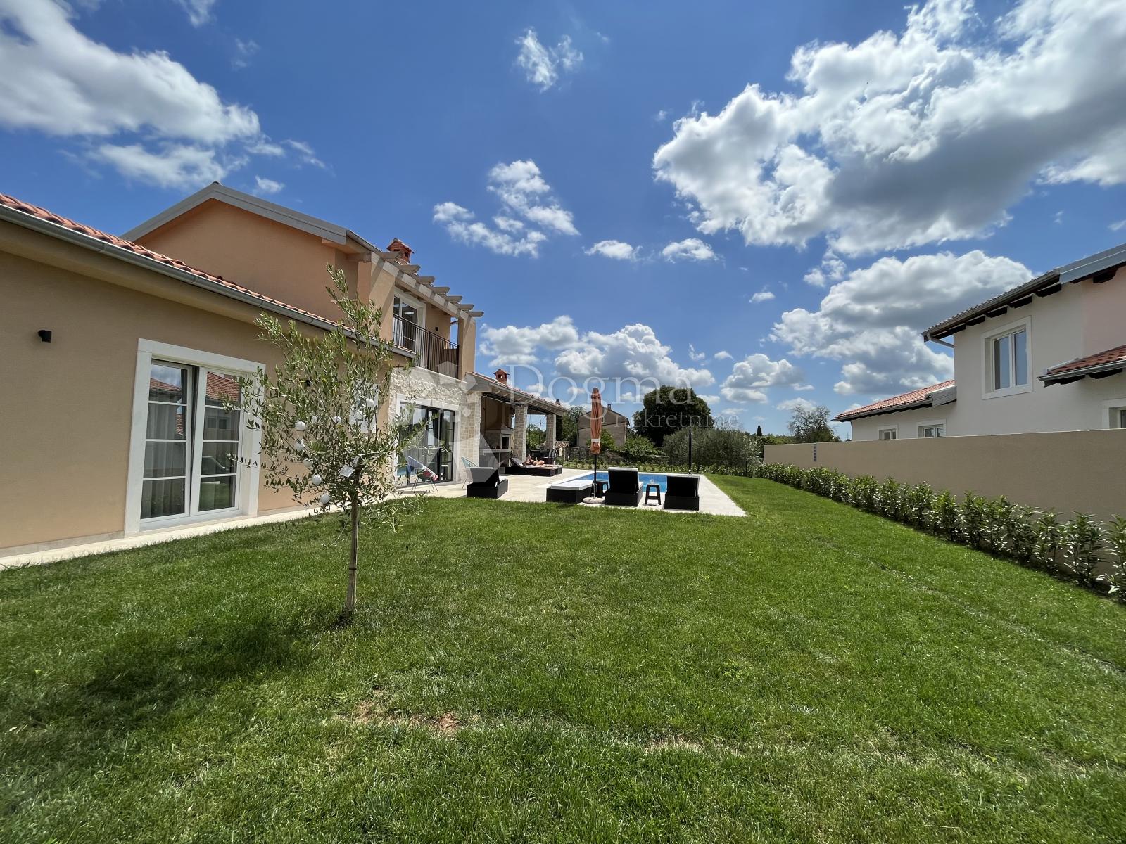 Za dugoročni najam nudi se luksuzna, potpuno namještena i opremljena vila površine 186 m² s grijanim bazenom od 38 m², izgrađena 2023. godine prema najvišim EU standardima. Smještena u mirnom naselju, vila pruža potpunu privatnost, udobnost i djelomičan pogled na more prema Rovinju.
