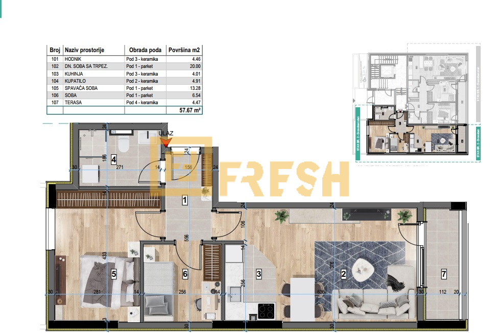 U ponudi je dvosoban stan, površine od 57.67m2 sa rasporedom: ulazni hodnik, dnevni boravak sa kuhinjom i trpezarijom, dvije spavaće soba, kupatilo i terasa.