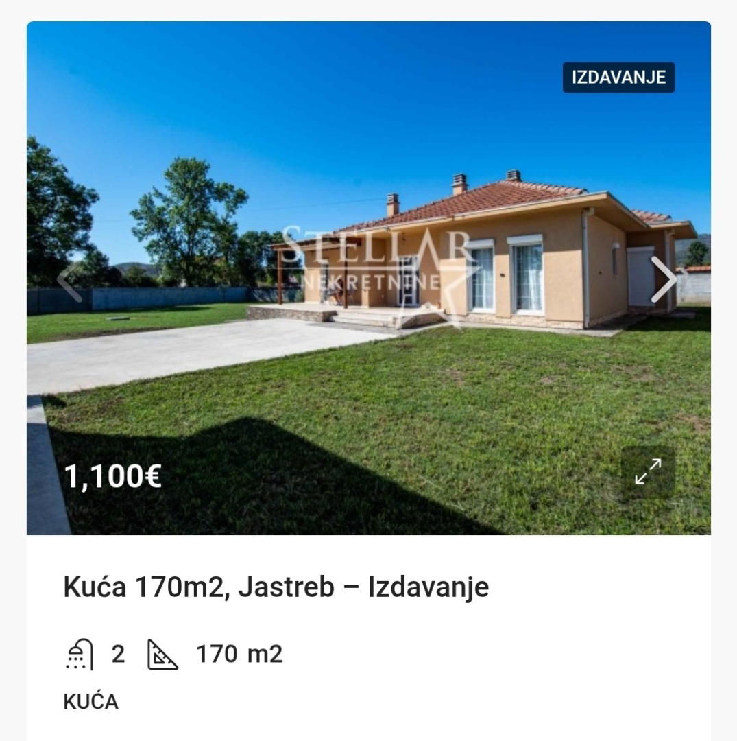 Opis: A luxuriously furnished house for rent in Danilovgrad, in a quiet and family-friendly neighborhood of Jastreb. The house has a total area of 170 square meters, including terraces, while the useful internal area is about 140 square meters. In terms of structure, it consists of two comfortable bedrooms, a bathroom, an additional toilet, a hallway, a storage room and a large open room of 100 square meters consisting of a living room, dining room and kitchen.